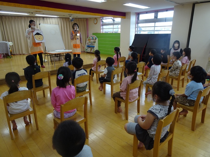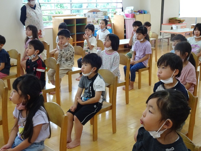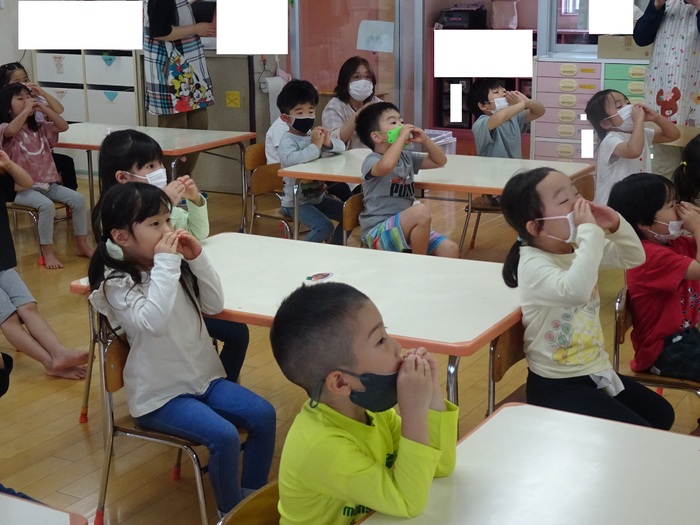 6月14日(火) 市の歯科衛生士さんにはみがき指導をしてもらいました。口の体操、歯のみがき方、うがいの仕方を教えてもらいました。 らいおん組さんは6歳臼歯が生えているかをチェックしてもらい6歳臼歯のみがき方も教えてもらいました。 仕上げみがきの大切さも教えてもらった子どもたち。「おうちの人に仕上げみがきをしてもらってね」と言われると「はーい❤」と返事をしていましたよ。 歯をみがいたあとは仕上げみがきもよろしくお願いします! | ||