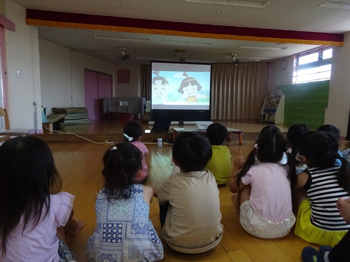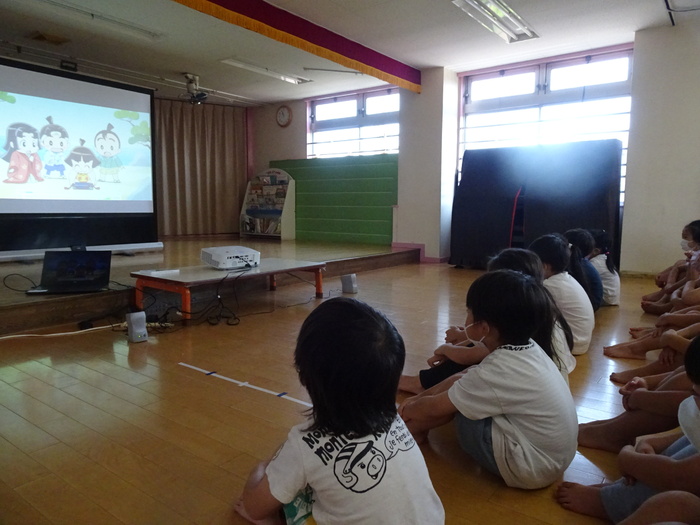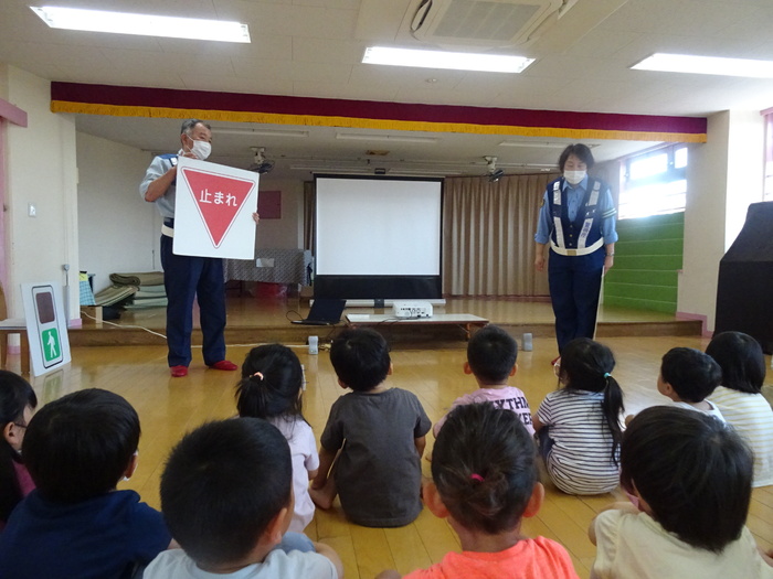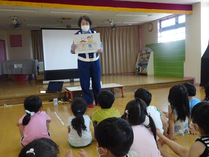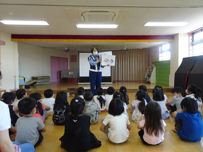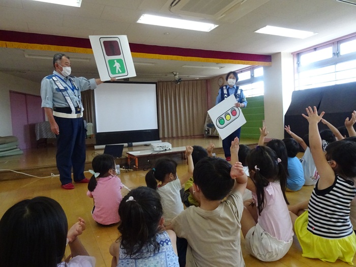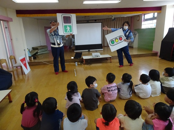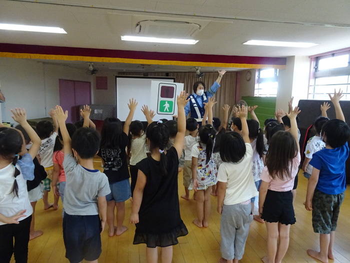 6月28日(火) 東大和警察署のおまわりさんに交通ルールを教えてもらいました。 信号の見方、横断歩道の渡り方や道路には飛び出さない、道路では遊ばないというお話をDVDやパネルで見ました。 交通ルールをしっかり覚え、大切な命を守りましょう! | ||