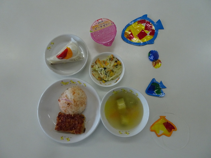 給食 サーモンライス チーズととうふのハンバーグ ズッキーニのスープ ゼリー おやつ ケーキ むぎちゃ | ||