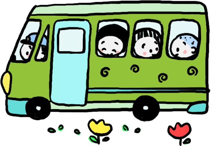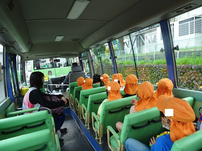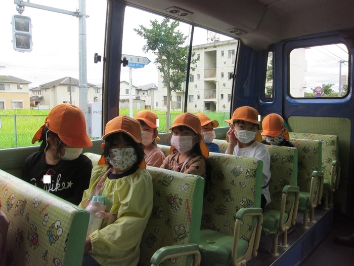 らいおん組さんが理事長先生の畑にじゃがいも掘りに行きました。 バスに乗って、出発! たくさんじゃがいも掘るぞー!! | ||