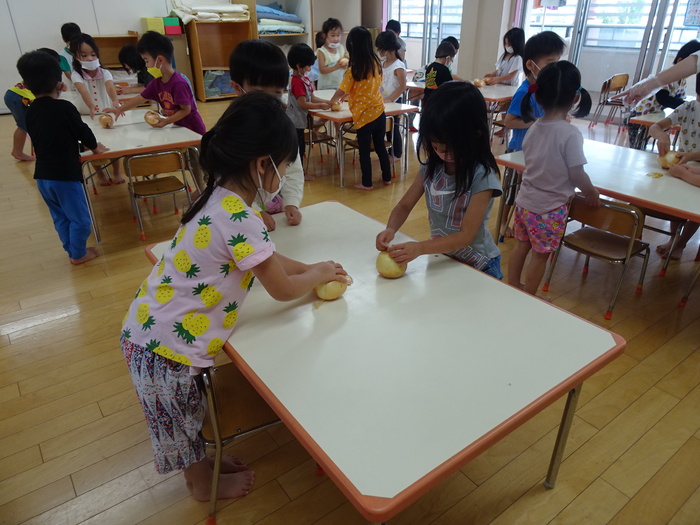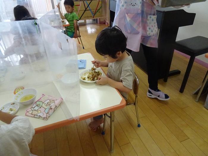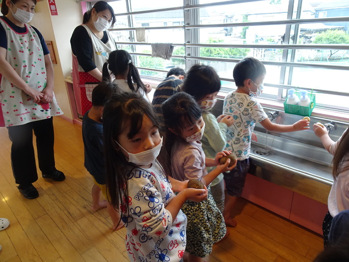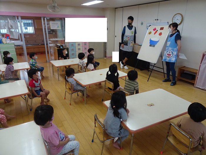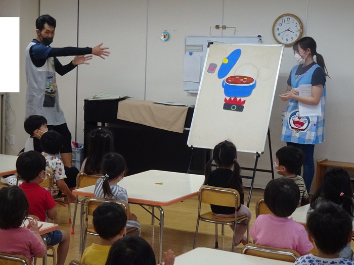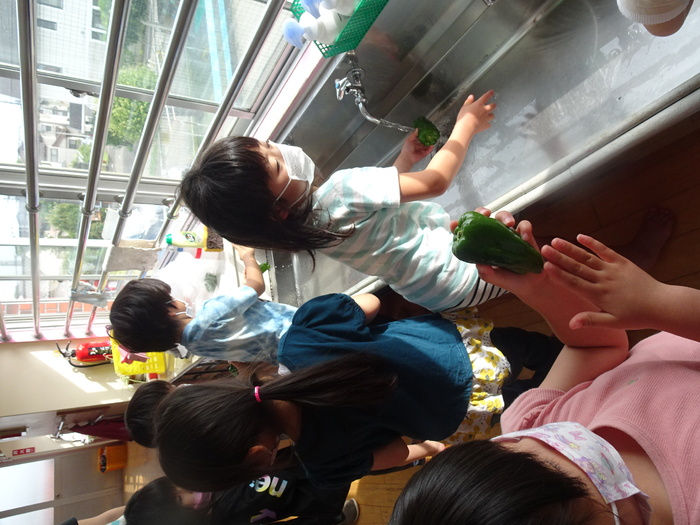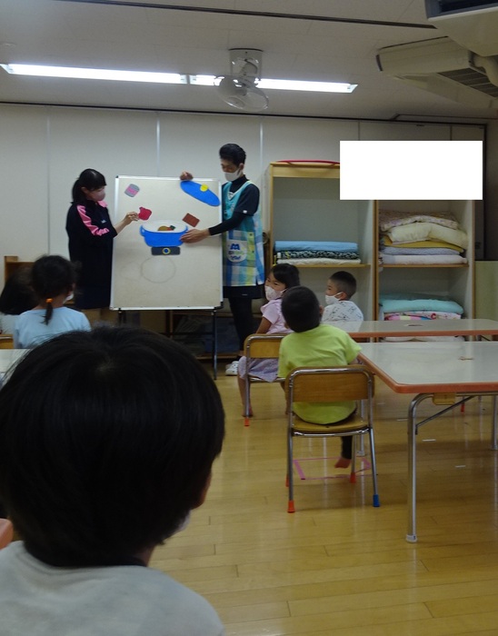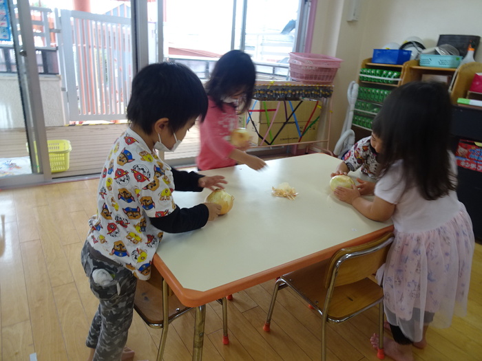 カレー作りのお手伝いでらいおん組、くま組は野菜洗い、玉ねぎの皮むきをしました。 ひつじ組、くま組は「カレーライス」のパネルシアターも見ました。 | ||