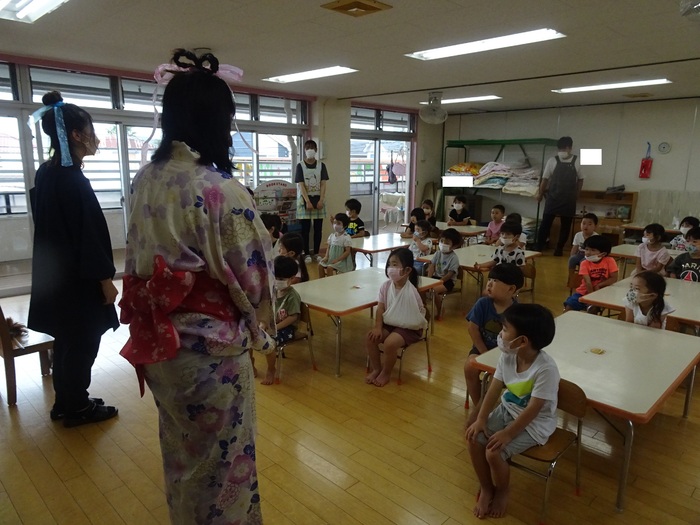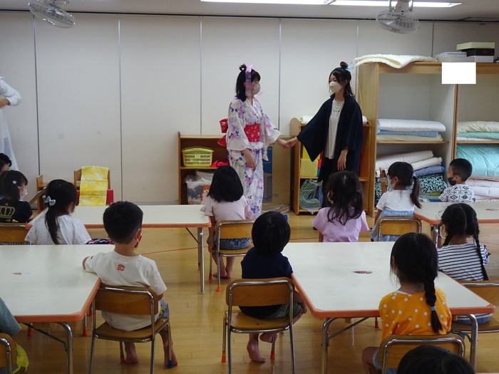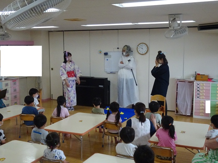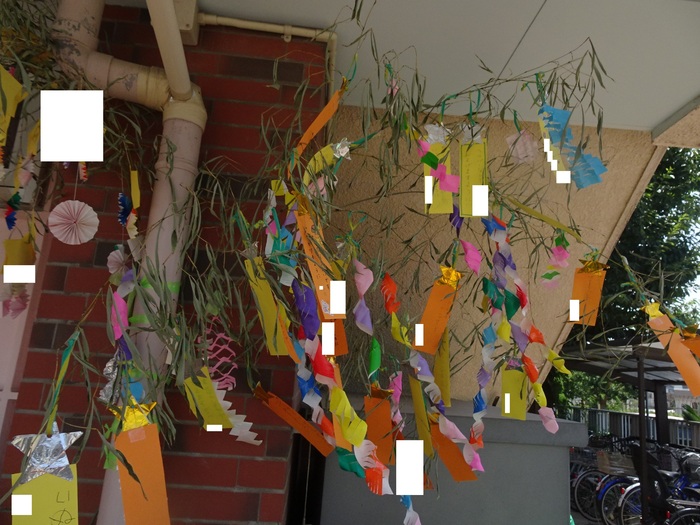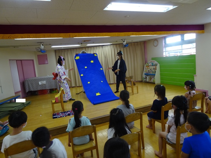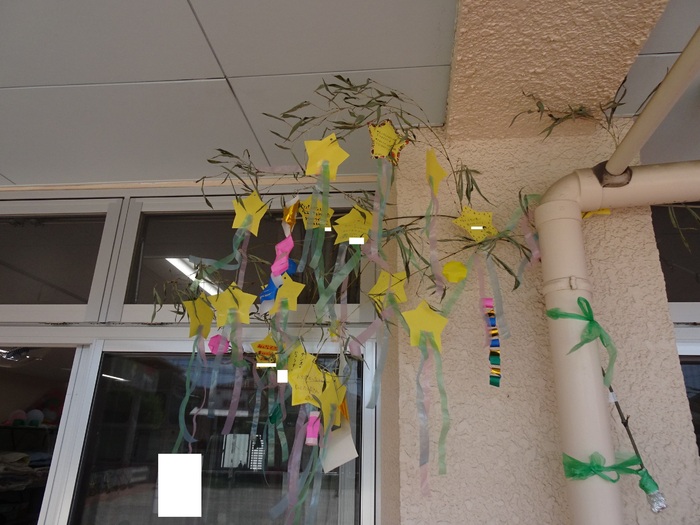 7月6日(水) めぐみ保育園では1日早かったのですが七夕祭りをしました。 今年はクラスに1本ずつ笹を用意し、短冊や笹飾りを飾りました。 七夕祭りは「七夕のお話」の劇を先生たちがしてくれました。 | ||