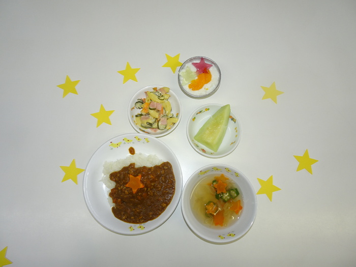給食 星カレー 星のこスープ マカロニサラダ くだもの おやつ たなばたゼリー むぎちゃ | ||