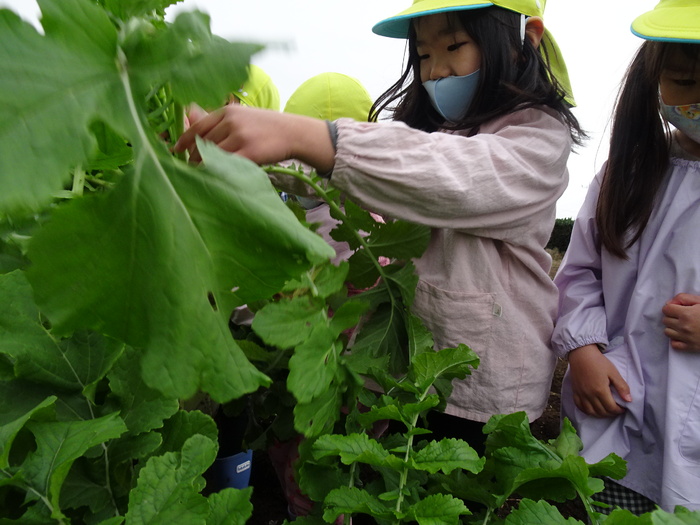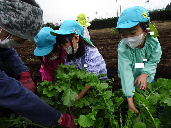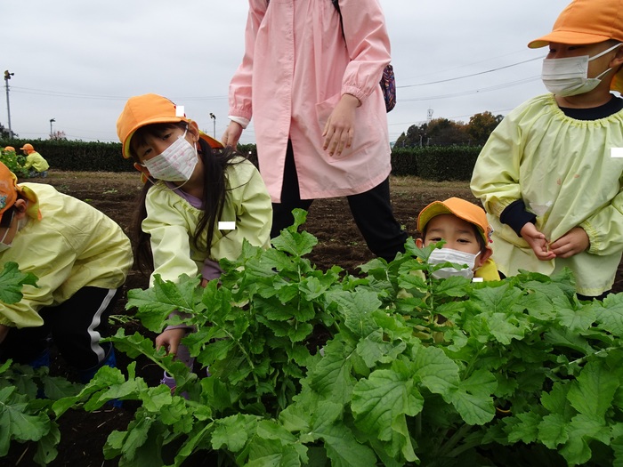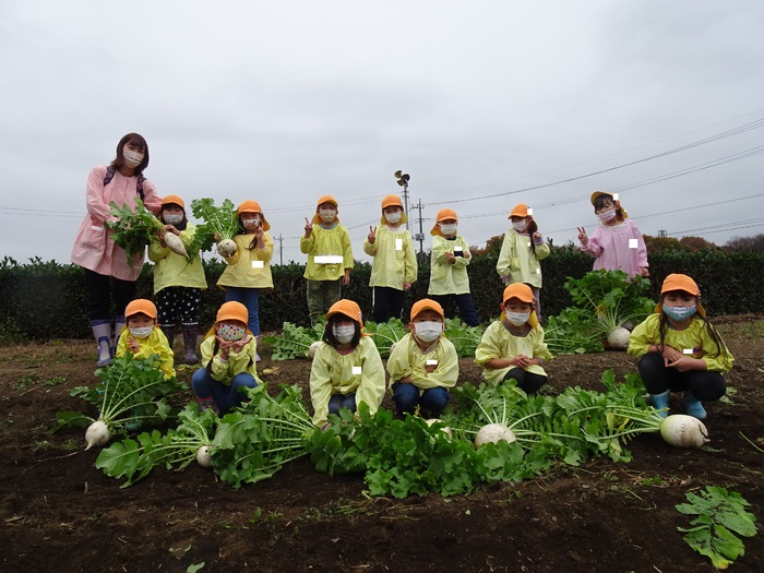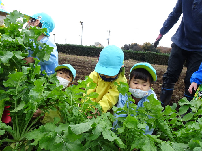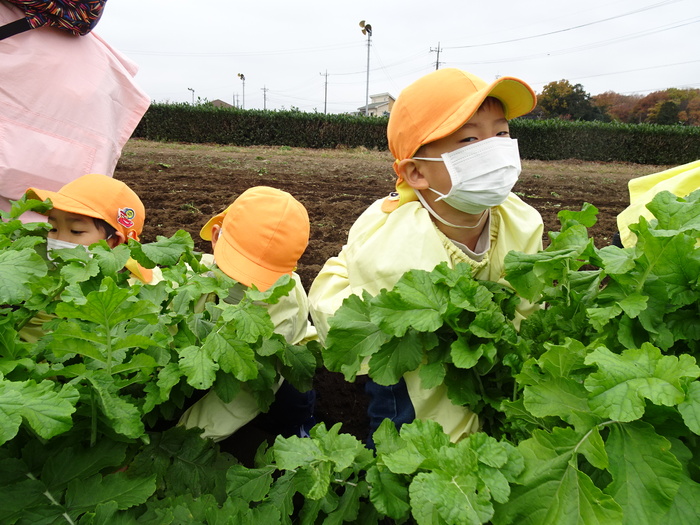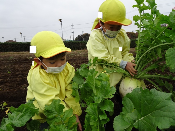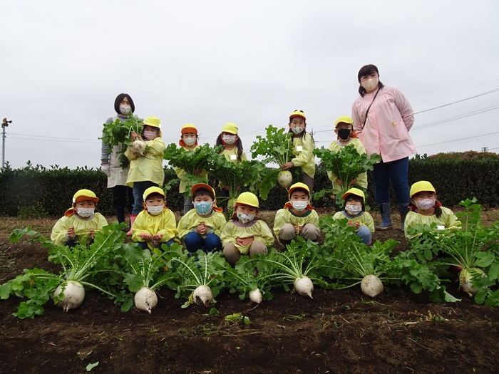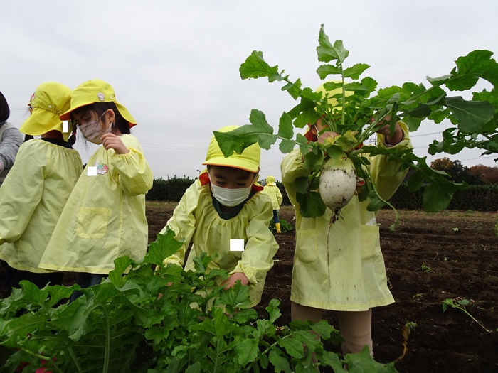 くま組(4歳児)とらいおん組(5歳児)の子どもたちが入間にある理事長先生の畑にバスに乗って大根掘りに行ってきました。 畑には大きな『聖護院大根』が沢山出来ており力いっぱい引っ張っていました。 | ||