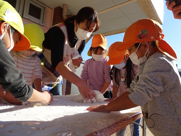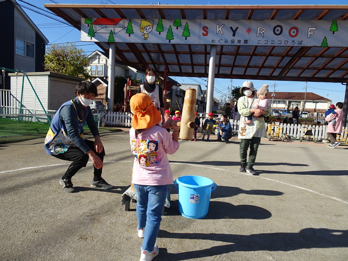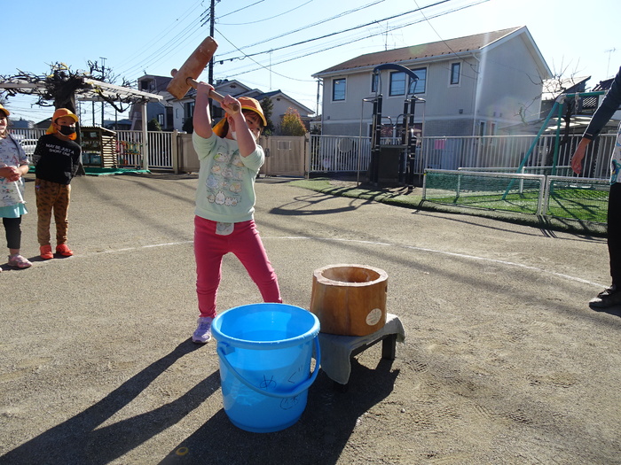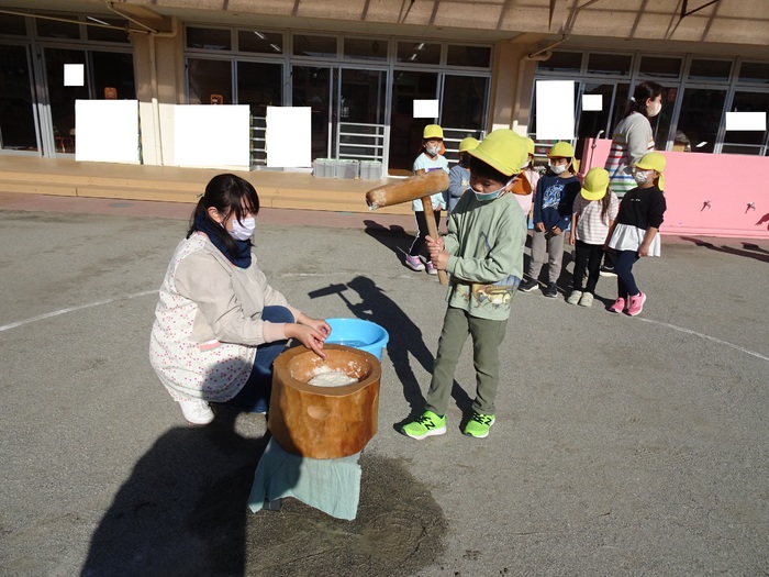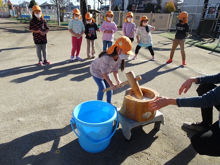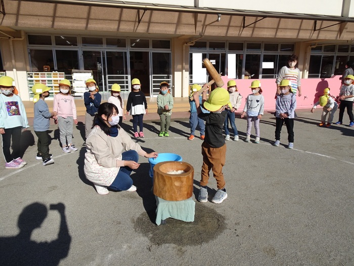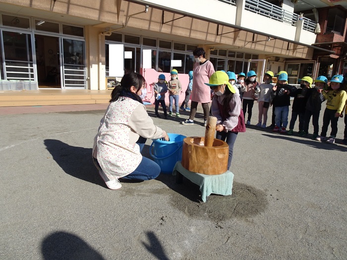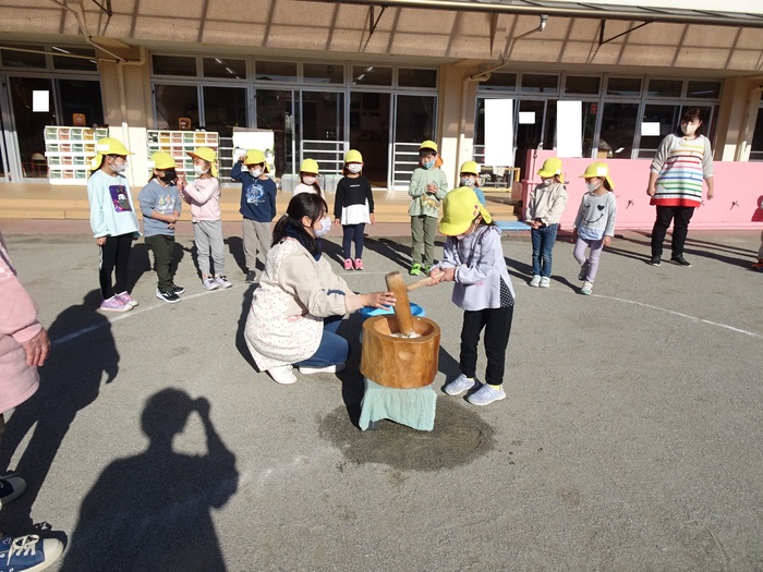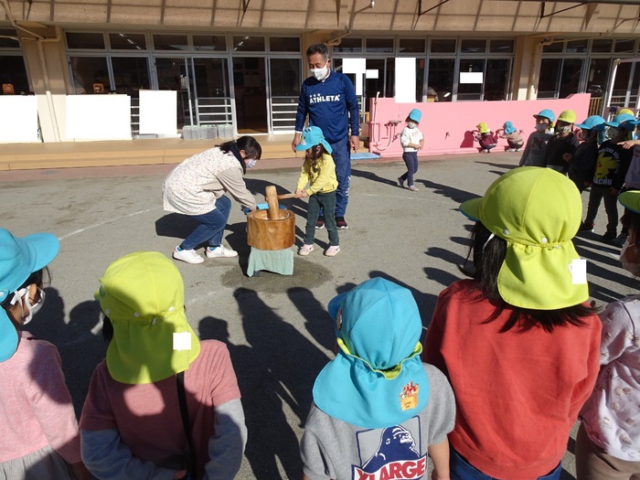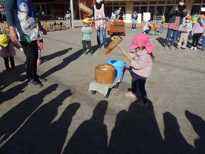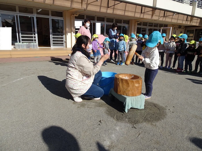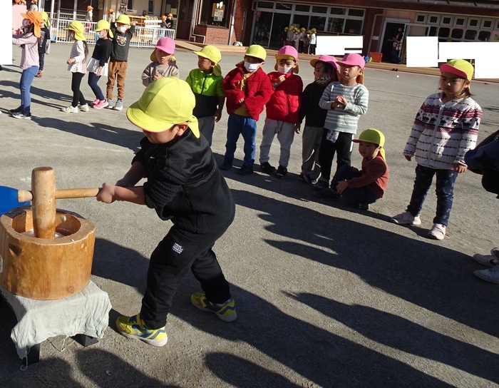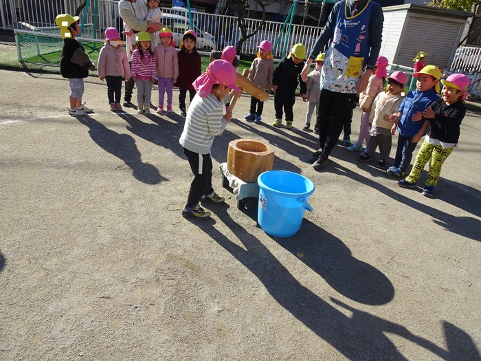 ひつじ組(3歳児)・くま組(4歳児)・らいおん組(5歳児)がおもちつきをしました。 「よいしょー!!」と力強い掛け声が園庭に響き渡っていました。乳児クラスもテラスで興味津々でおもちつきを見ていました。 | ||