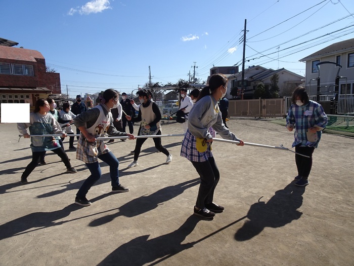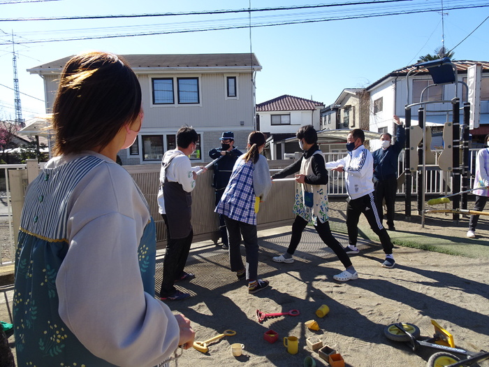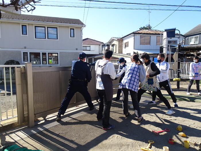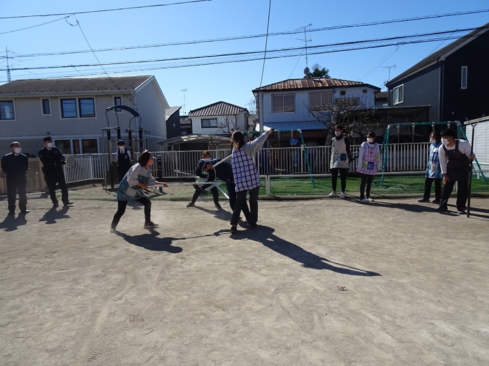 お巡りさんが来て、保育園に不審者が入ってきた時の対応の仕方を教わりました。子どもたちは速やかに避難し、職員は、実際にシュミレーションをしてさすまた等を使った訓練を教わりました。 | ||