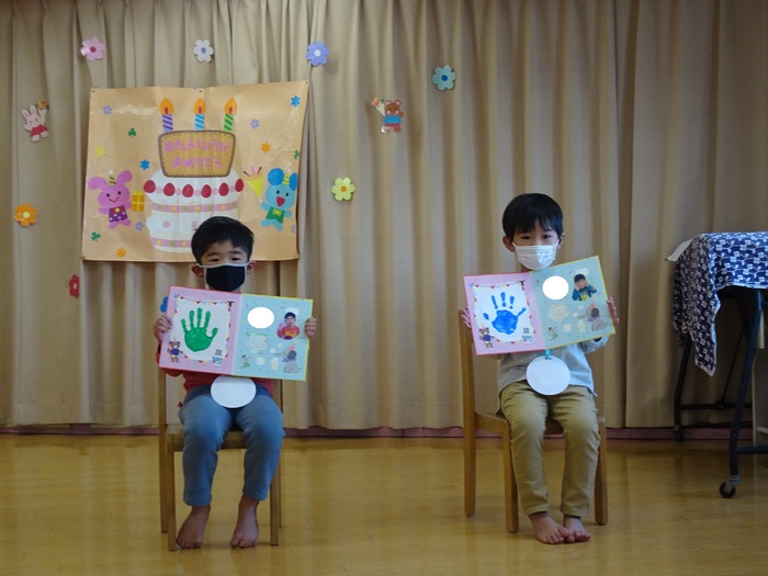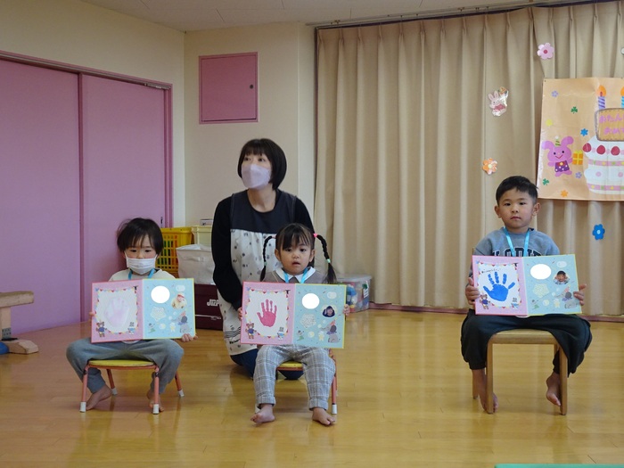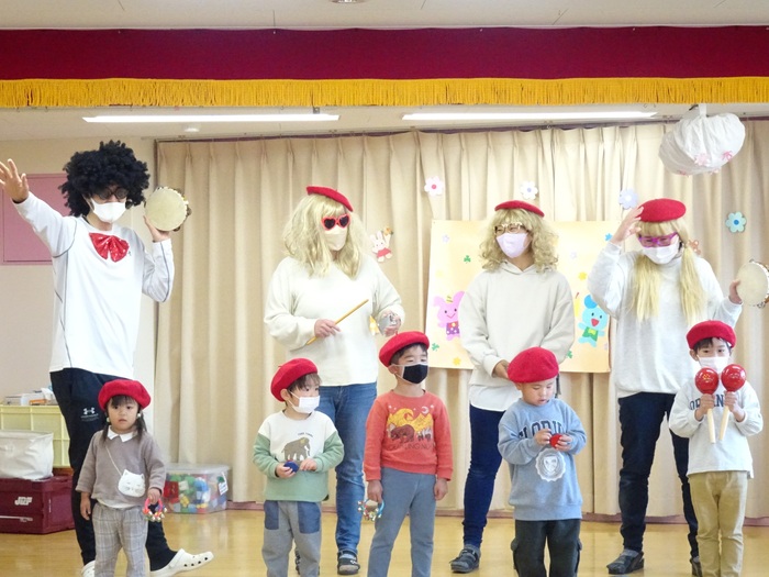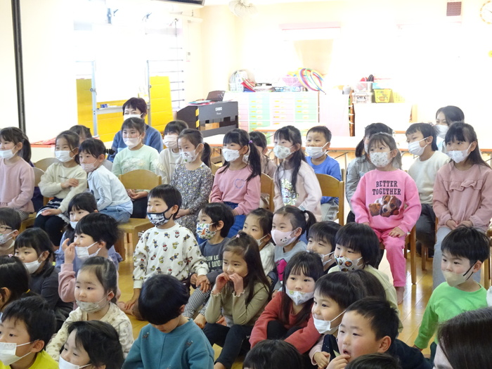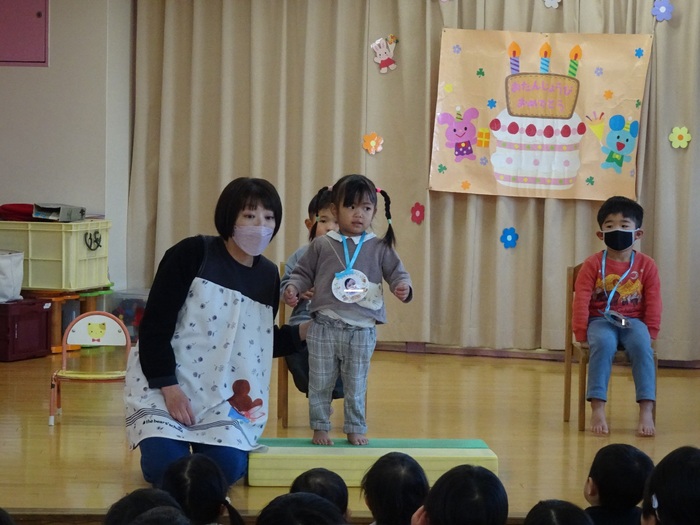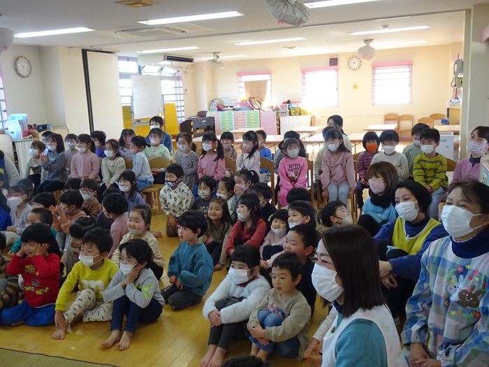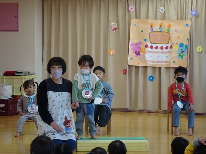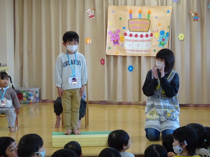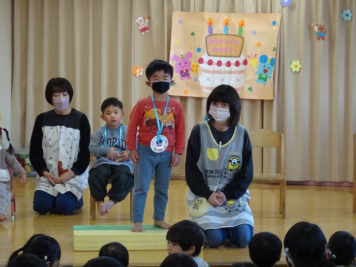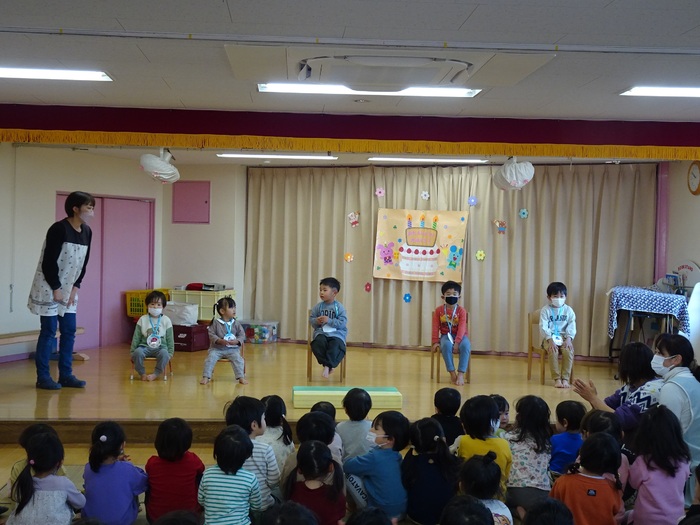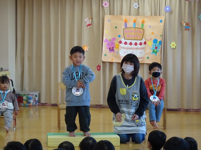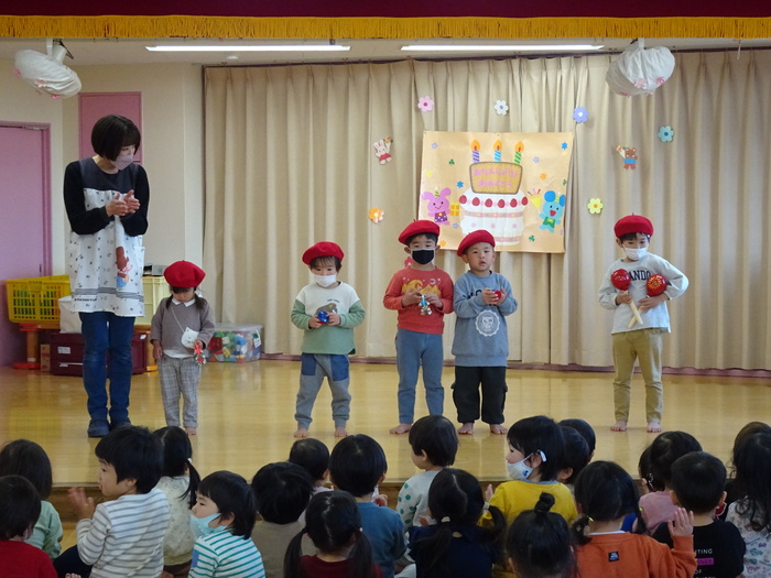 2月は、感染症が落ち着いていたので、ホールでみんなで誕生会をすることが出来ました。誕生者のお友だちと先生で合奏を披露してくれました。 | ||