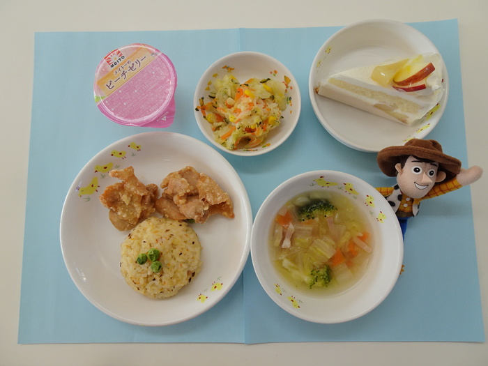 ツナピラフ しおからあげ コールスローサラダ ベーコンスープ ゼリー おやつ ケーキ むぎちゃ | ||