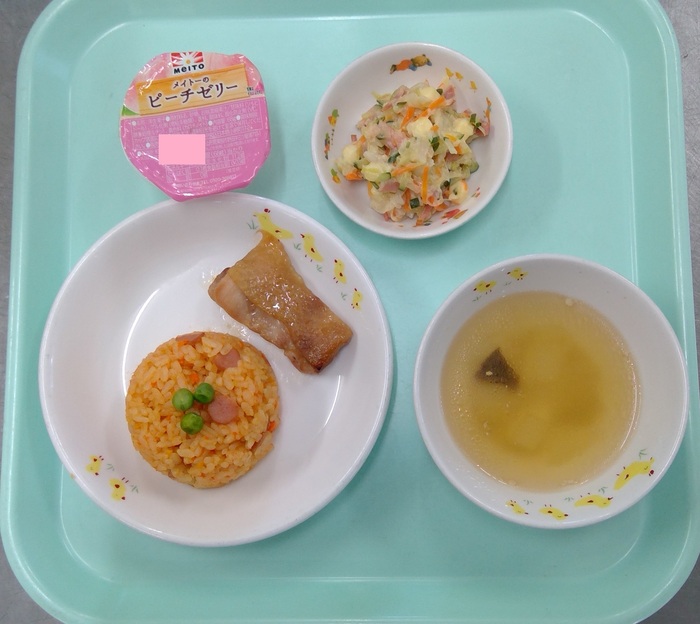 誕生会メニュー ケチャップライス イタリアンサラダ 鶏肉レモン塩焼き 冬瓜スープ ゼリー おやつ ケーキ | ||