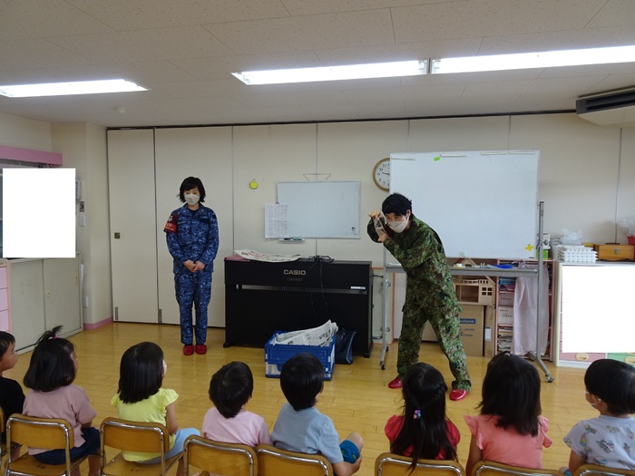 防災教室 自衛隊の方が来て幼児クラスの子どもたちに新聞紙でスリッパの作り方を教えてもらいました。災害時に身近なもので足を守る大事なアイテム。子どもたちも一生懸命折っていました。子どもたちからも質問があり有意義な時間となりました。 | ||