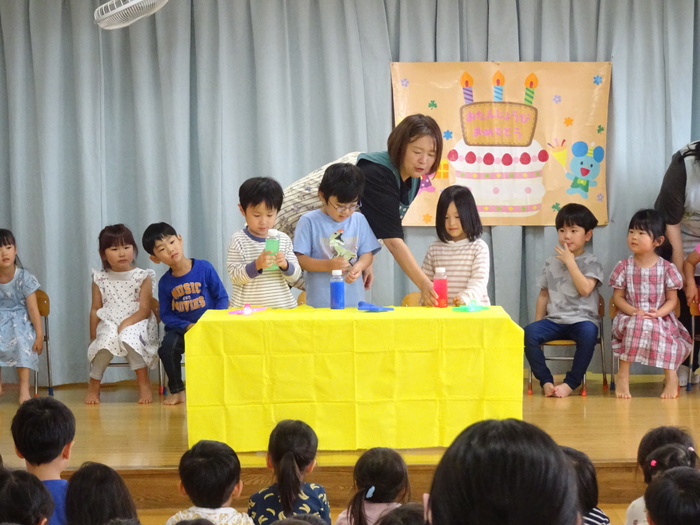 誕生会がおこなわれました。 お誕生日のお友だちがたくさんいたので、今月は2部に分かれておこないました。 幼児クラスの誕生会の出し物は、手品です! お誕生日のお友だちに、手伝ってもらって素敵な手品を披露しました。 お誕生日おめでとう!! | ||