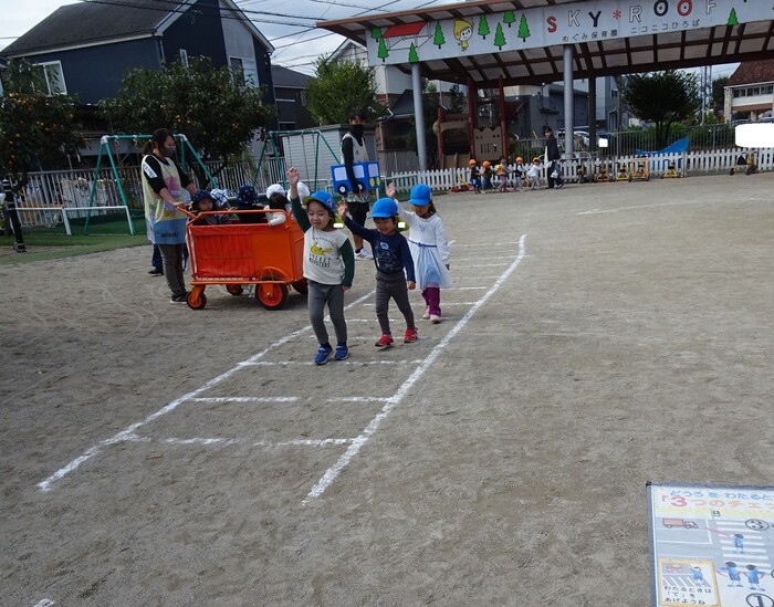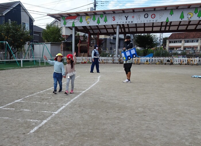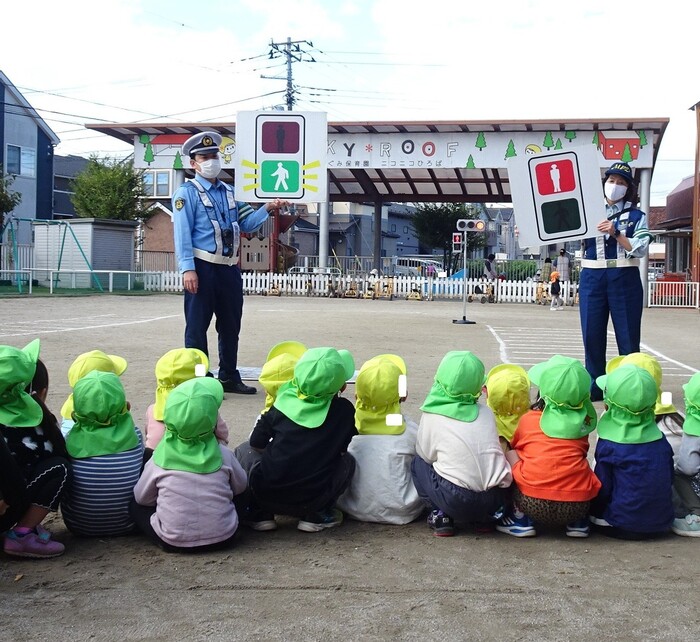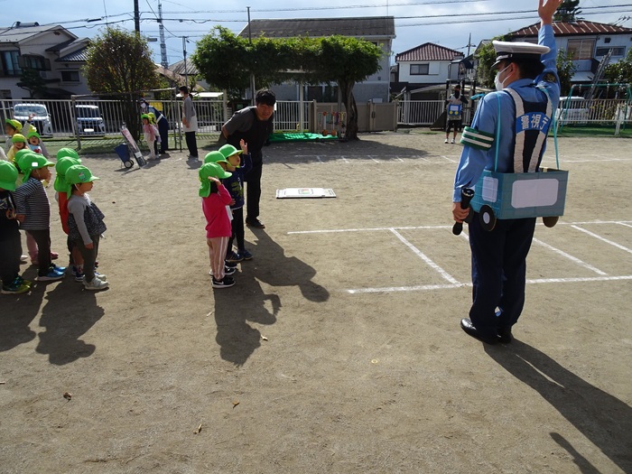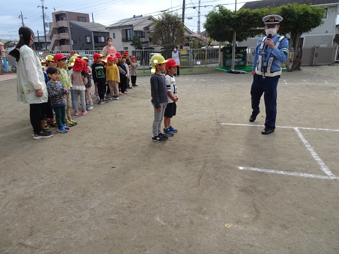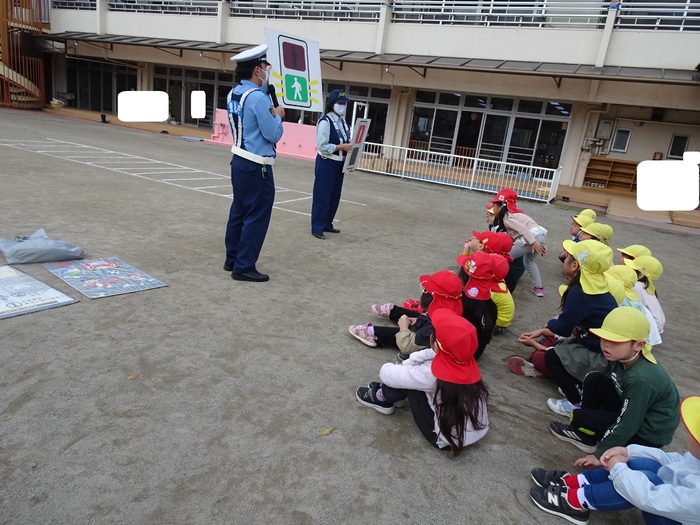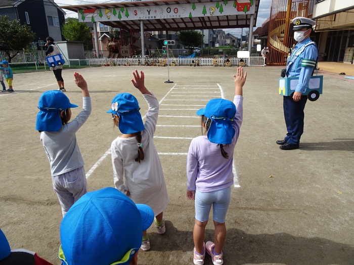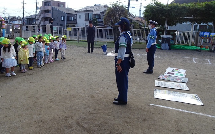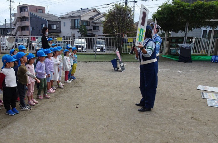 東大和警察署の方が、交通ルールや横断歩道の渡り方についてお話してくれました。 その後に、信号機を見ながら道路を渡る練習をしました。 | ||