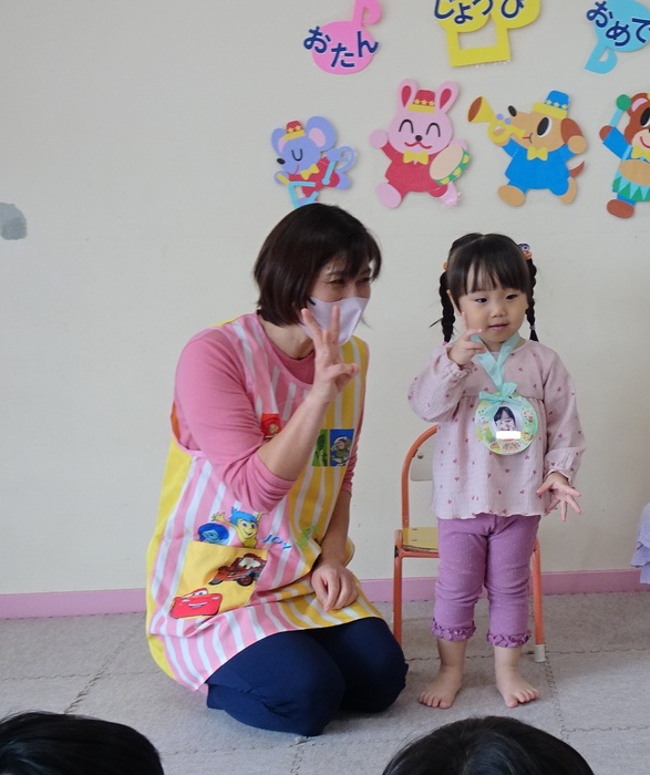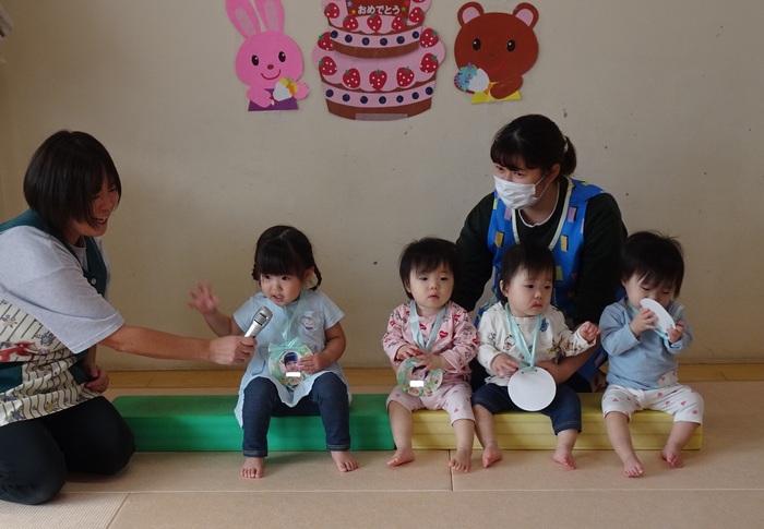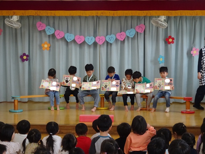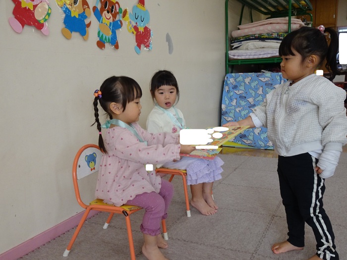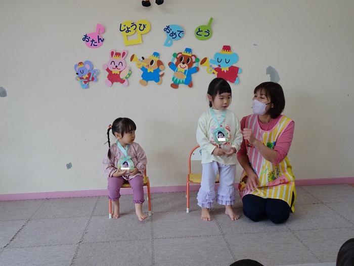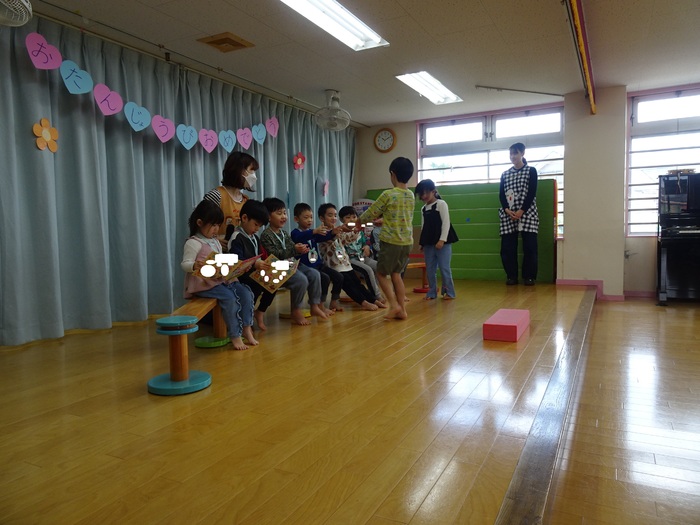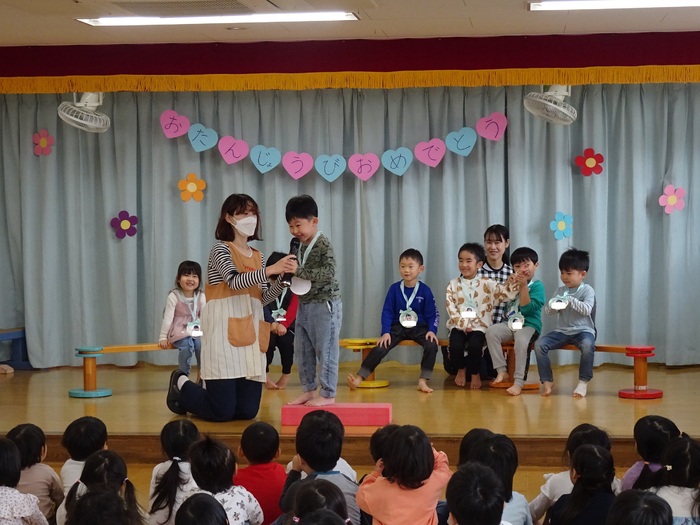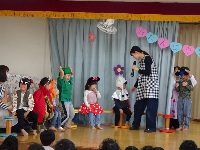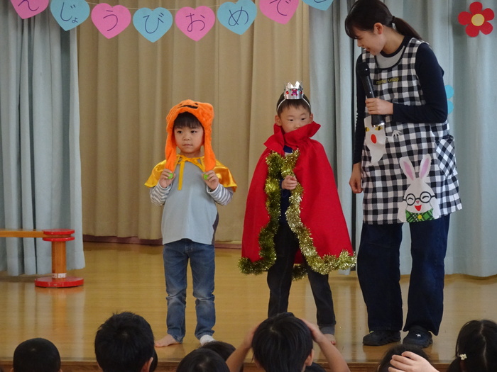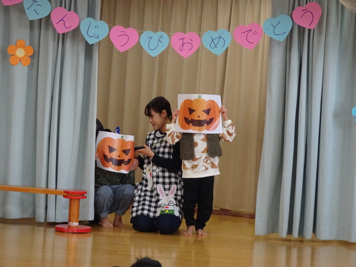 誕生会がありました。 今月は、ハロウィンにちなんでお誕生日のお友だちが仮装をして、 クイズを出してくれました! | ||