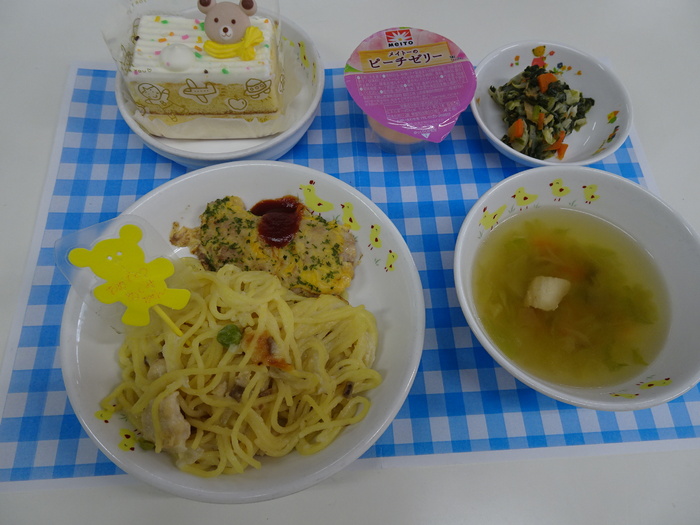 <誕生会メニュー> チキンクリームスパゲティ ポークピカタ ほうれん草サラダ レタスときくらげのスープ ゼリー <おやつ> ショートケーキ | ||