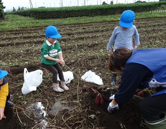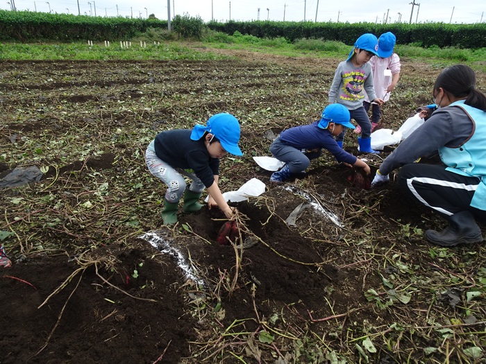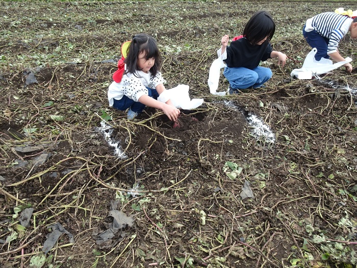 4・5歳児がバスに乗ってさつまいも掘りに行ってきました。 大きなお芋がたくさん採れたので、子どもたちは大喜びでした! | ||