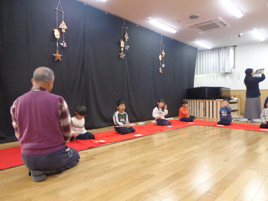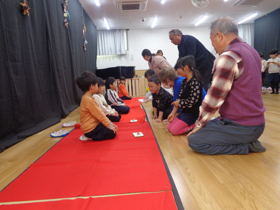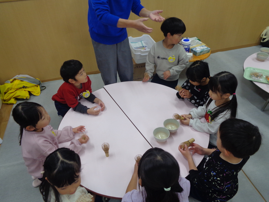 | 今日のお茶会は、かぜさんが参加してくれました。かぜさんがぴしっと背筋を伸ばして座る姿に、お茶の先生とお手伝いの地域の皆さんから「かっこいいね」とお褒めのお言葉をいただき、緊張しながらも嬉しそうなみんなでした。初めてのおちゃたてに苦戦したかぜさんでしたが、さすがのにじさん!手際よく素早くお茶をたてる姿にこれまた「すごいね」とお褒めお言葉をいただきました。楽しく、所作や言葉遣い、立ち振る舞いを学ぶことが出来ると素敵ですね。 | ||