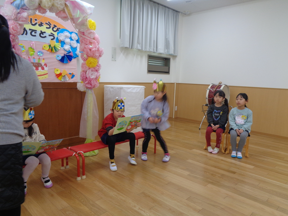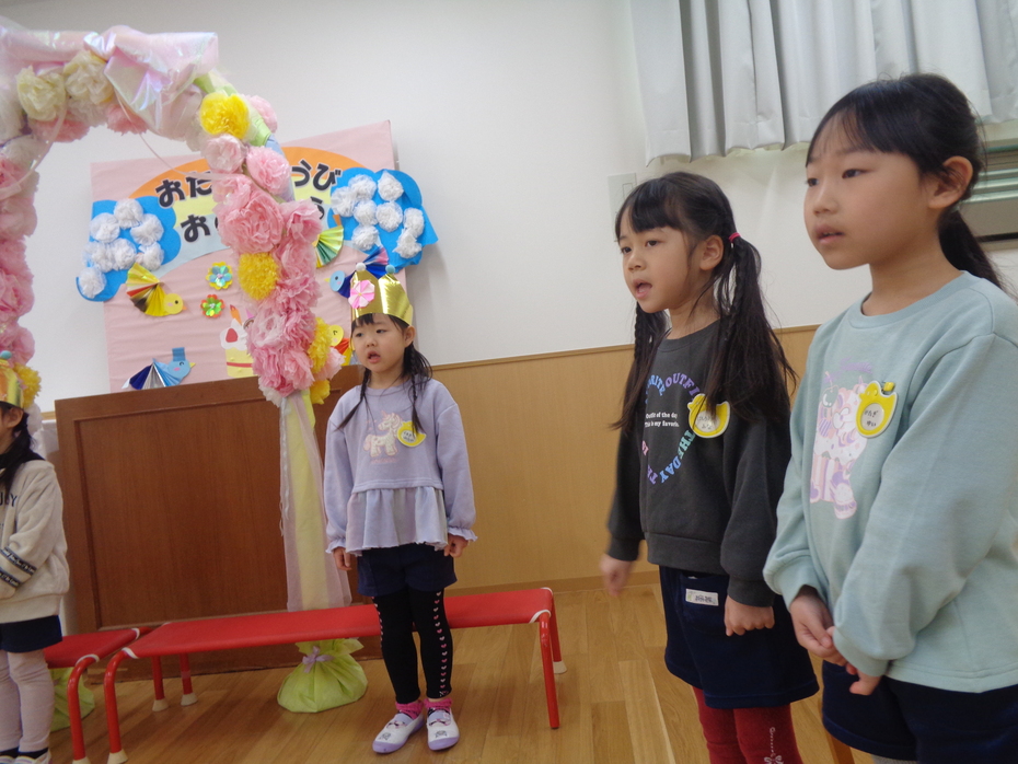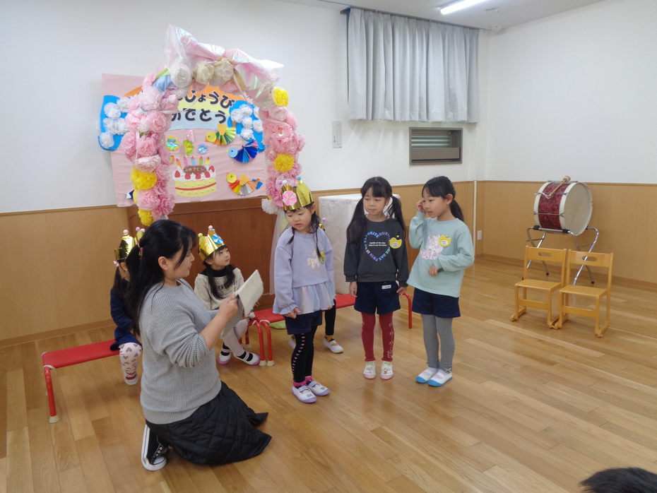 | みんなのお楽しみ!誕生日会♪お祝いするお友だちも、祝われる子ども達も、みんな笑顔で楽しい時間を過ごしました。にじさんのお祝いのプレゼントは、発表会でも披露してくれた『にじ』の曲に合わせた、歌と合奏でした。何度聞いても、「じ~~~ん」としてしまいます・・・????誕生会も残すところあと一回!いろいろな事が、最後だねとなってくる3学期末。寂しさもありますが、一日いちにちを大切に!皆で笑顔で過ごしていきたいと思います♪おたんじょうびのみんな、おめでとう!! | ||