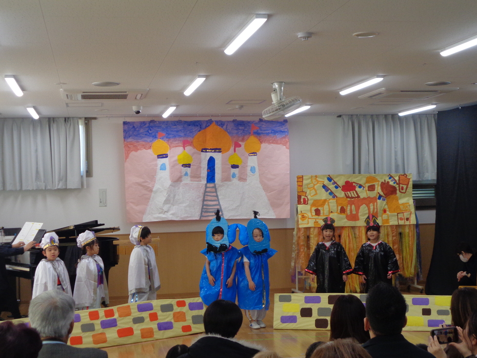 | 今年度も生活発表会が無事に終わりました。当日の日まで、どのクラスも皆で『おはなしあそび』をしてきました。お話の世界で自分の考え(アイデア)を発表したり、自分の考えたことを担任の先生が素敵な表現を考えてくれたり・・・そんな風にどのクラスも試行錯誤しながら、クラスらしさを盛り込んだ発表ができたのではないかな・・・と思います。当日は、保護者皆さん、来賓の皆さんに見ていただき、より『表現活動の楽しさ』を味わうことが出来たように思います。笑いあり、涙ありの発表会にお越しいただき、本当にありがうございました。 | ||