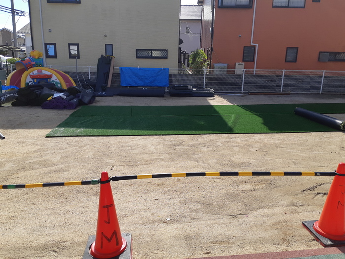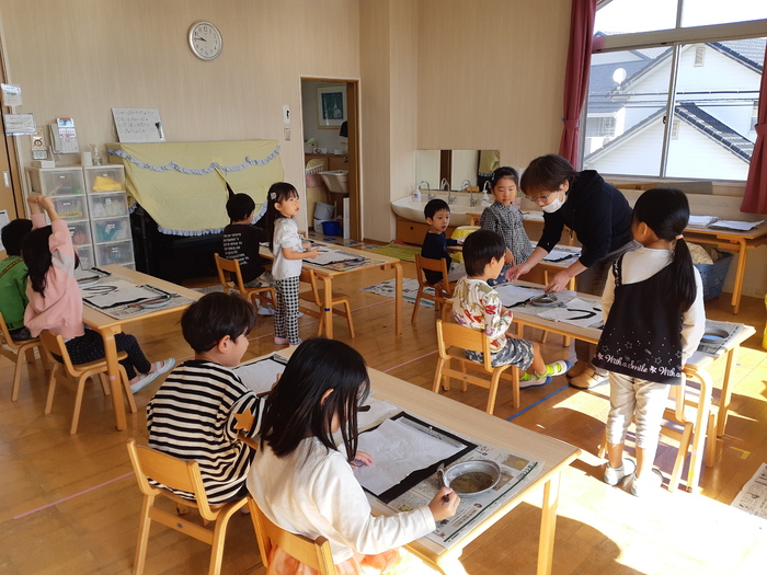 ぞう組さんが水習字をしました。「く」「り」など一文字を筆で書きました。来月は墨汁でお習字です!