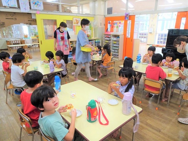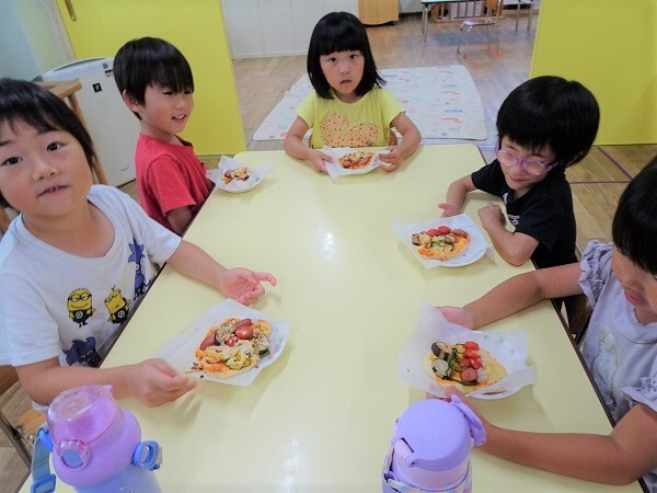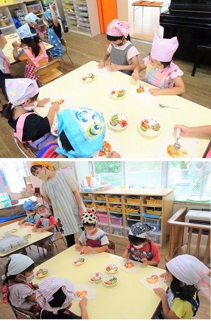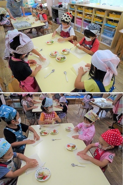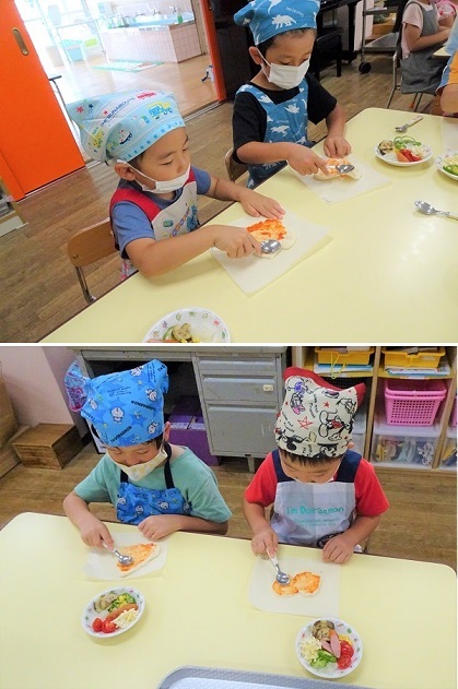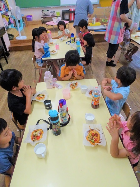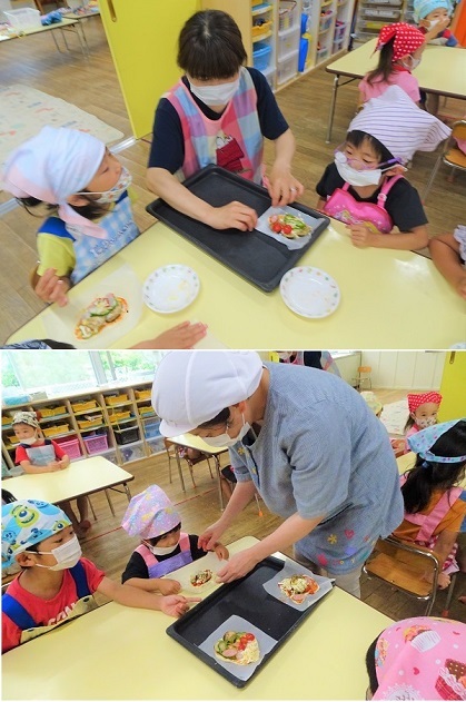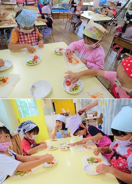 | 7月19日は食育の日です。月・雪・星組が「夏野菜ピザ」を作りました。具材にはピーマンやナスなどがあり、普段は野菜が苦手な子どもも自分が作ったピザを何とか頑張って食べていました。健康は食がとても大切です。少しずつ食べれるようになるといいですね。子どもたちの様子をご覧ください。 | ||