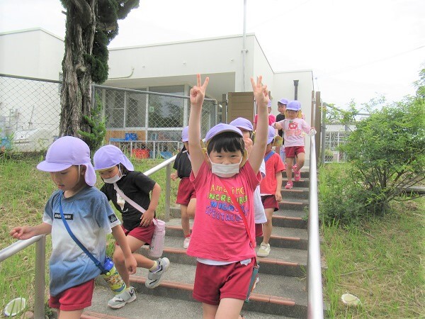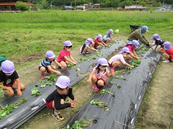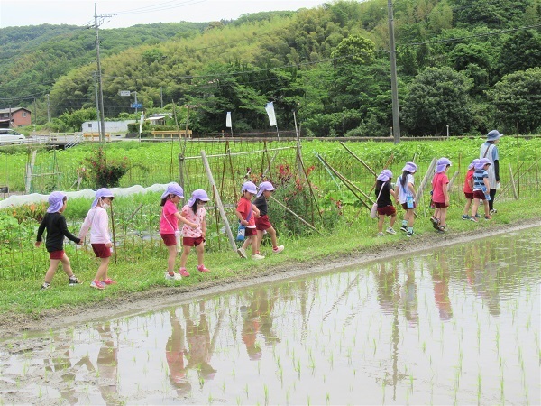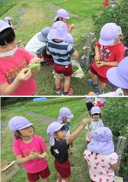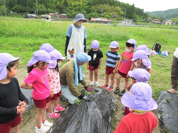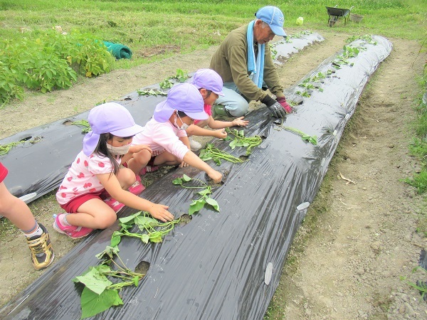 バスに乗って園外の畑に行き、さつま芋のツルを植えました。秋の収穫が楽しみです。子どもたちの様子をご覧ください。