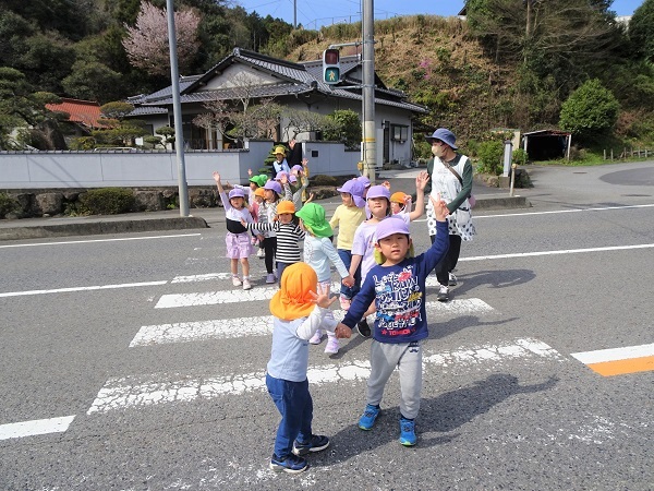 横断歩道では手を挙げて