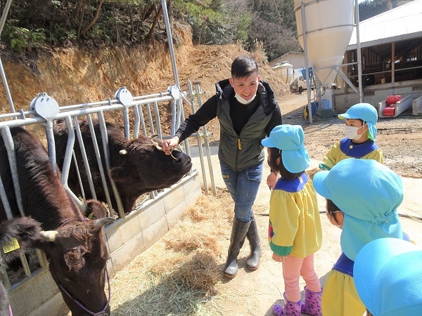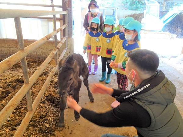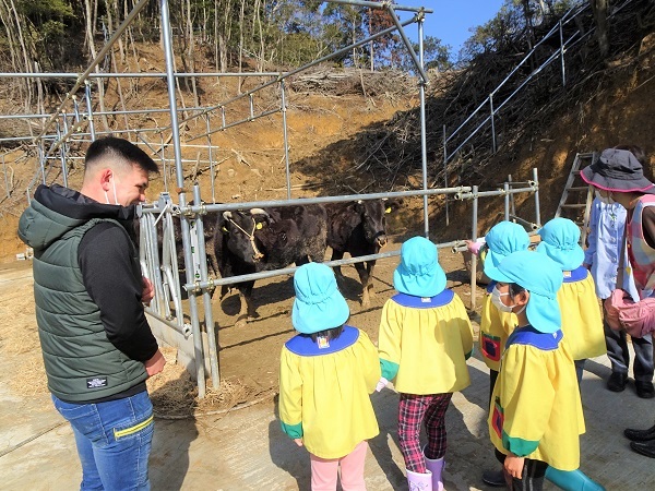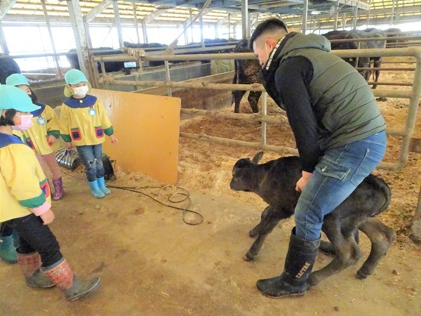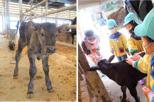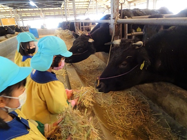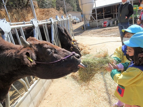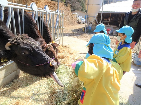 | 月組の子どもたちが牛を見に行きました。保護者の牛舎です。はじめ、大きな牛にビビっている子もいました。生まれたばかりの子牛とのふれあい、牛へのえさやりなどの活動で徐々に牛さんとの距離が縮まっていきました。帰る時間になって、「もう帰るの?」「あ~おもしろかった。」「楽しかった」と言っていました。生き物とのふれあいは、とてもいいものですね。子どもたちの様子をご覧ください。 | ||