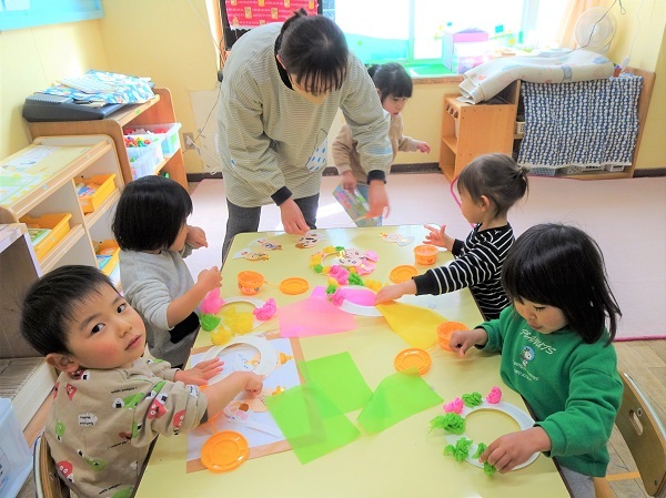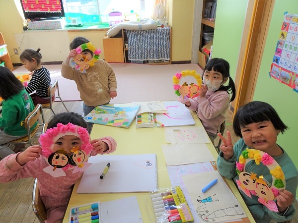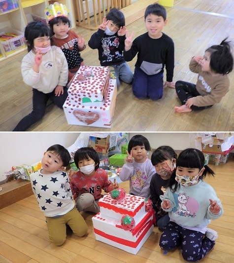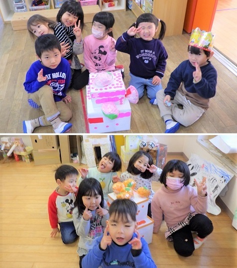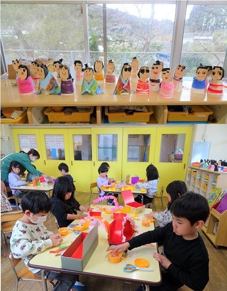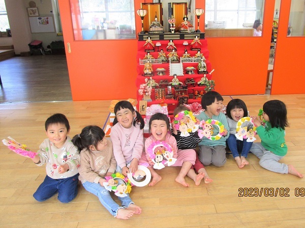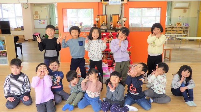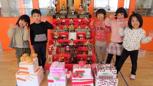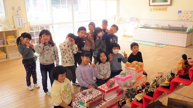 明日は「ひな祭り」です。保育園でも七段びなが飾られています。ひな壇の前には、園児が作ったお祝いのケーキ(オレンジ・桃・いちご・チョコレート)が供えられています。子どもたちの様子をご覧ください。