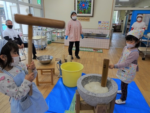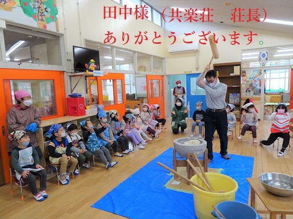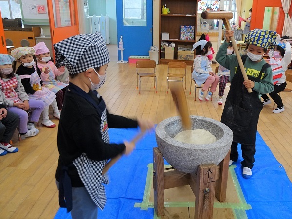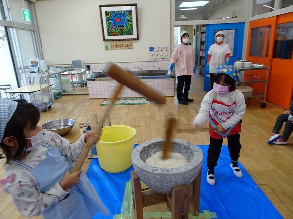 さあ、おおトリは、月組のおもちつきです。ついたおもちは、きな粉もちにして給食でたべます。又、おもちつきの様子を絵にかいています。子どもたちの様子をご覧ください。
