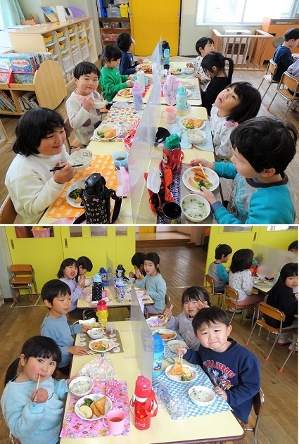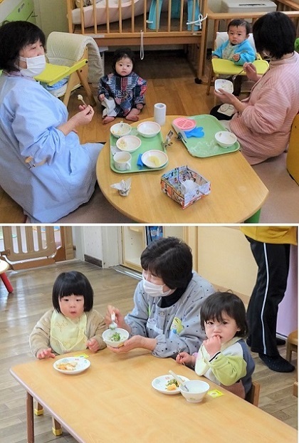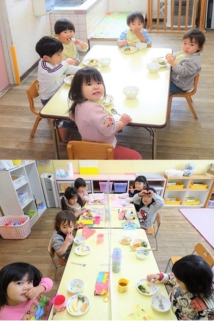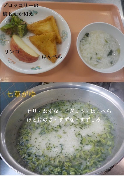 凧あげなどで遊んだ後、給食で七草がゆを食べました。小学生のころ、七草の名前を覚えた記憶が・・・。子どもたちの様子をご覧ください。