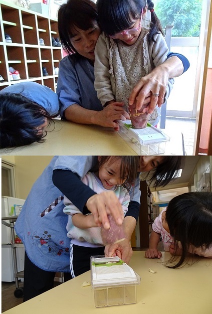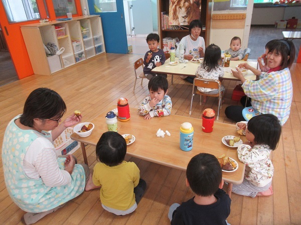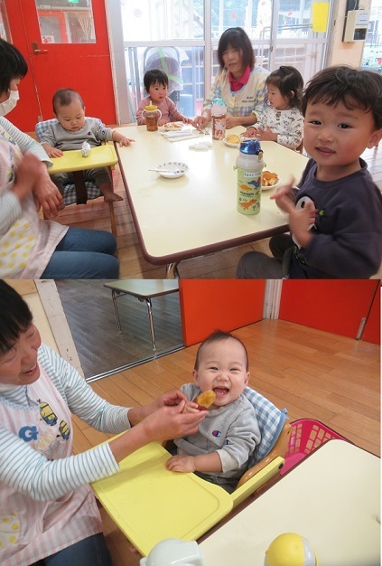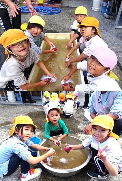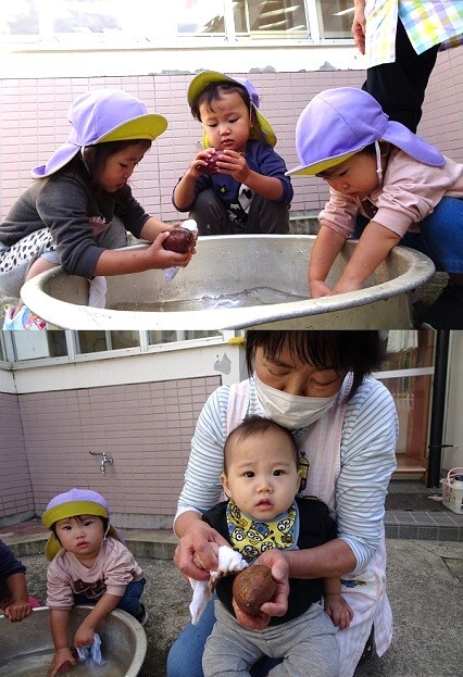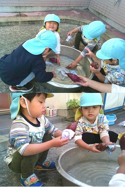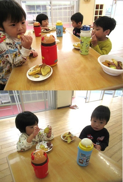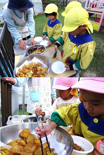 収穫したおいもをよく洗ってバイキング形式のおいもパーティーをしました。焼いも、さつまチップス、大学いも、とてもおいしかったです。子どもたちの様子をご覧ください。