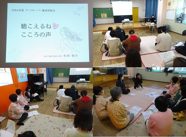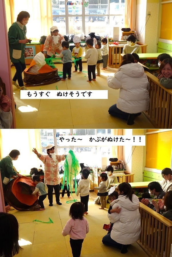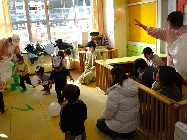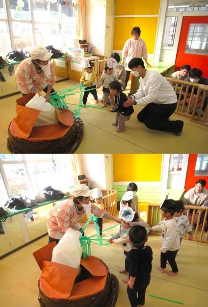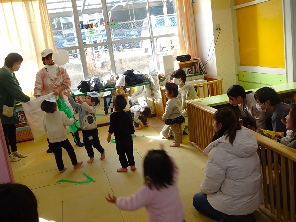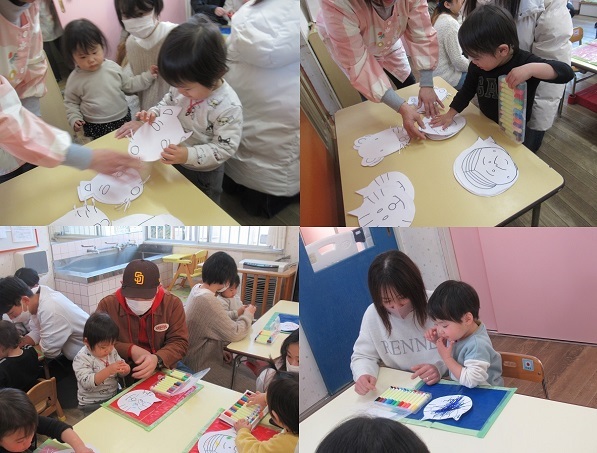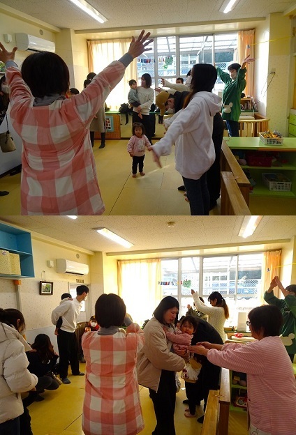 1月18日(土)3歳未満児クラス参観日がありました。体操や絵本の読み聞かせ、お面づくり・劇遊びなどを親子で活動しました。その後、保護者は親睦を深めるゲーム、研修会(ゲートキーパー養成研修)に参加しました。活動の様子をご覧ください。
