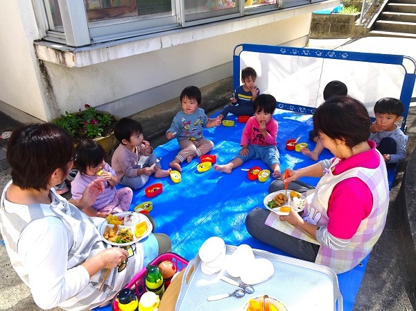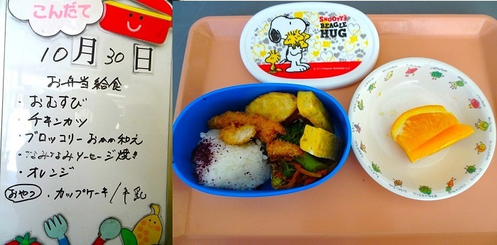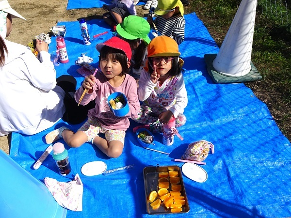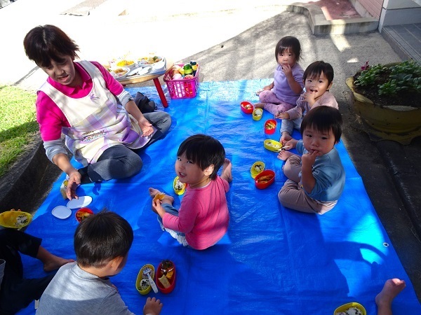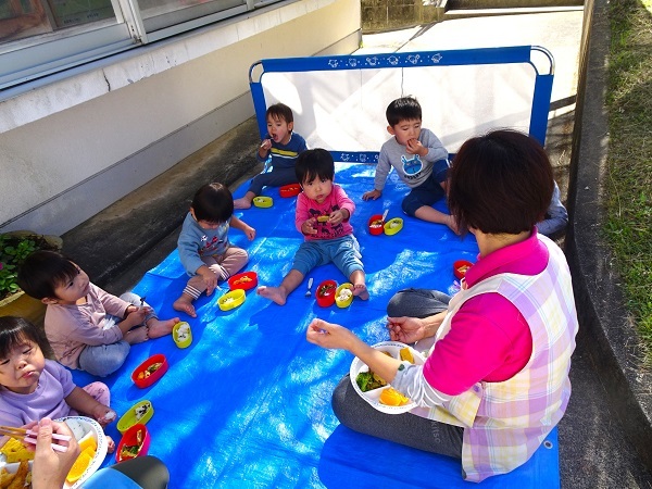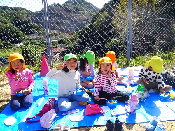 今日は、お弁当給食の日です。天気がいいので外で食べました。秋の日差しを感じながら食事する子どもたちの様子をご覧ください。