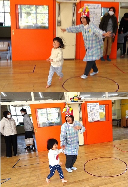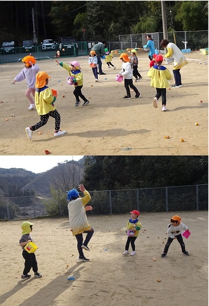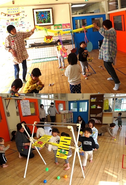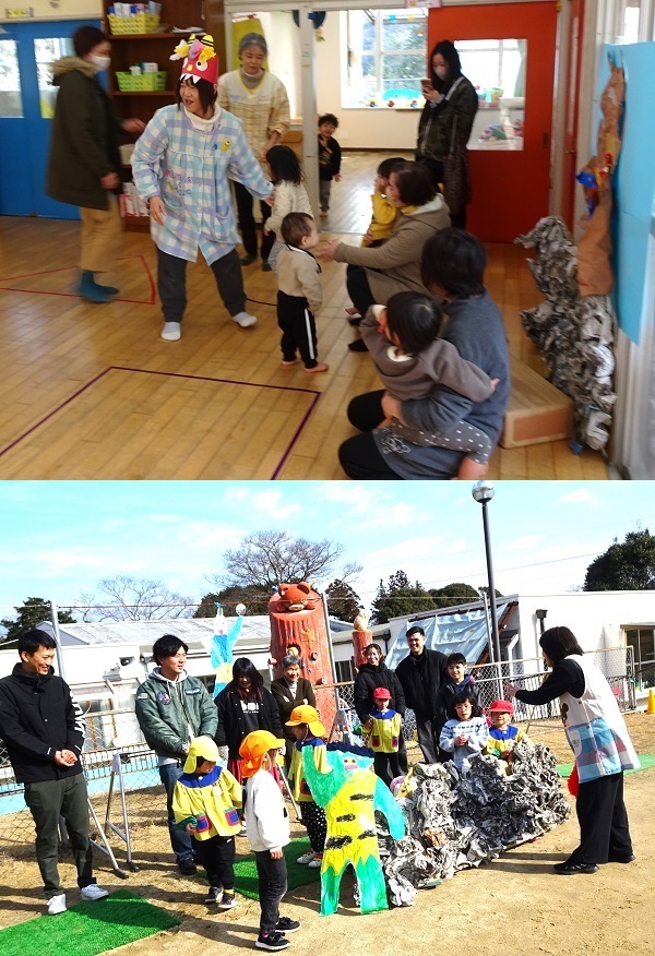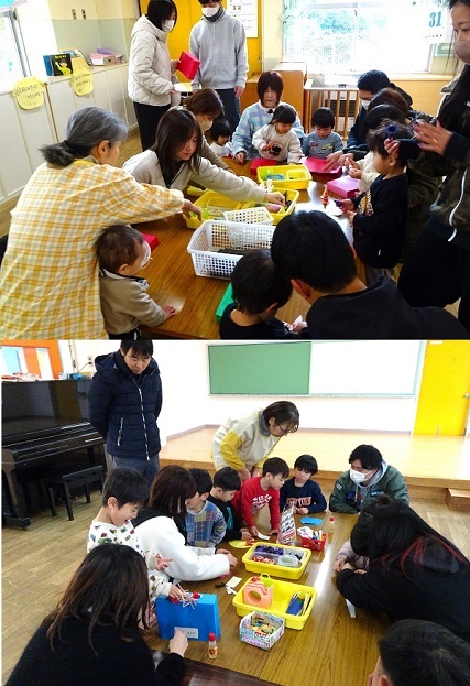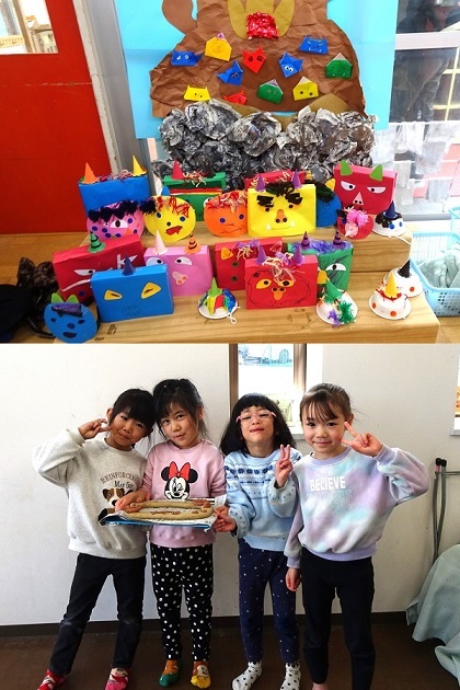 参観日がありました。保護者と一緒に月組は「卒園製作づくり」、それ以外の組は「鬼のお面づくり」をしました。その後、みんなで豆(紙ボール)まきも行いました。楽しんでいる様子をご覧ください。