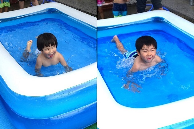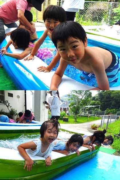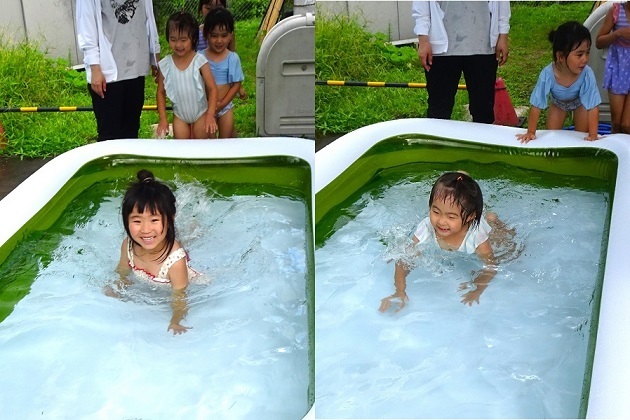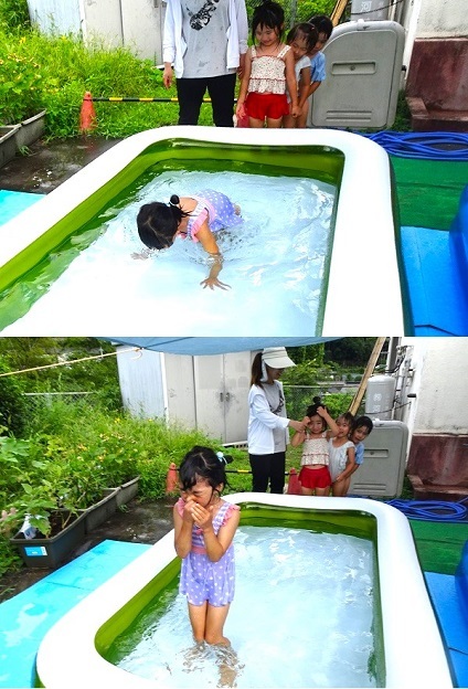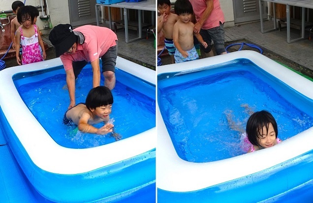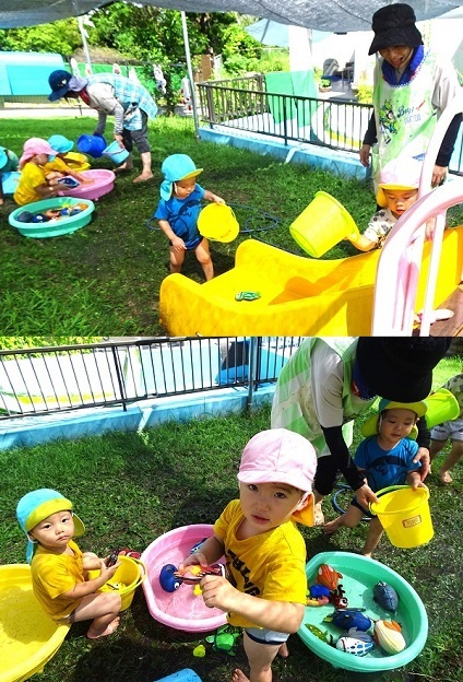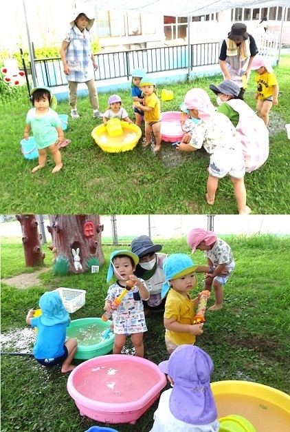 月・雪・星組は、プールで水遊び、花・つぼみ・ふたば組は中庭で水遊びをしました。楽しんでいる子どもたちの様子をご覧ください。
