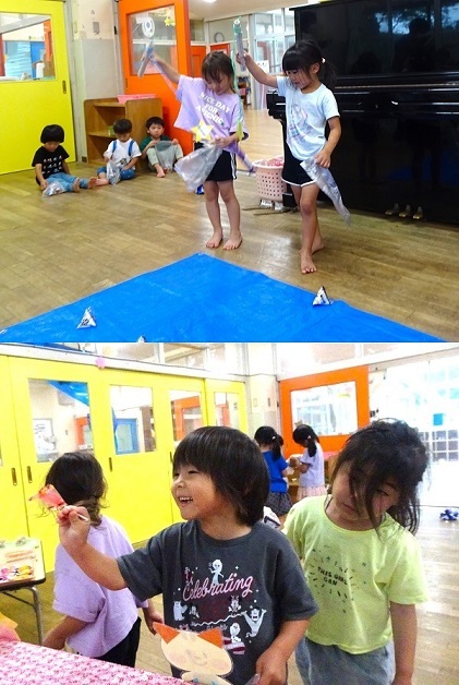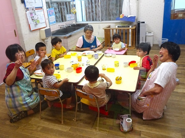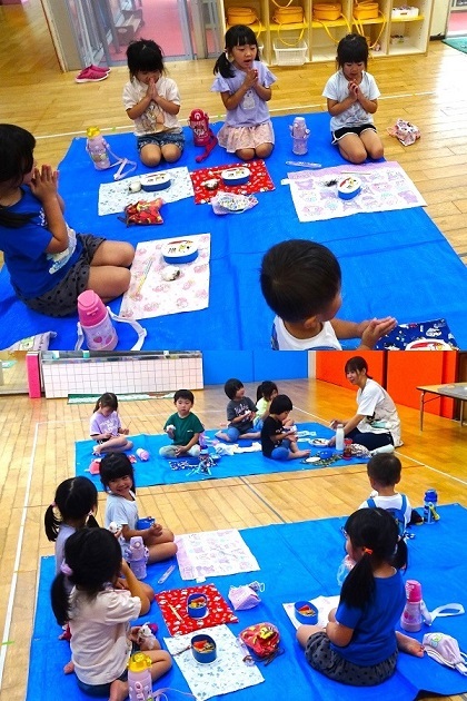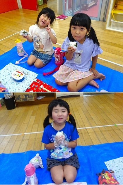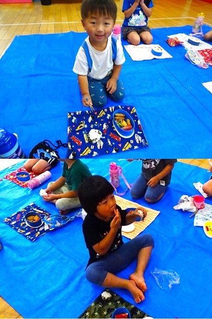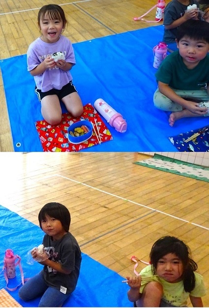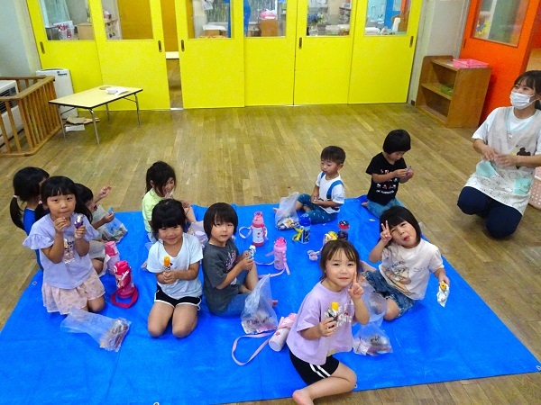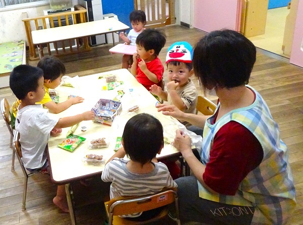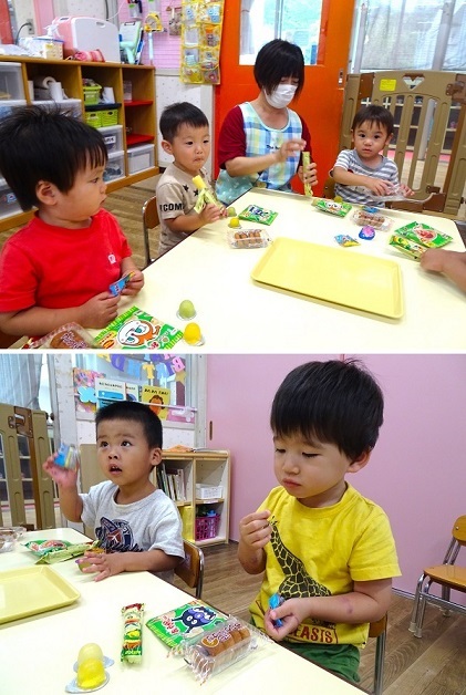 今日は、お弁当箱に入った給食(お弁当給食)とおやつバイキングがありました。年長・年中・年少の子どもたちに人気のおやつは、「うま〇ぼう」三歳未満児クラスは、「ラムネ菓子」「うま〇ぼう」でした。子どもたちの様子をご覧ください。