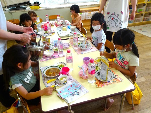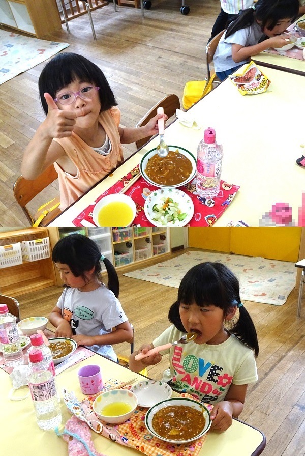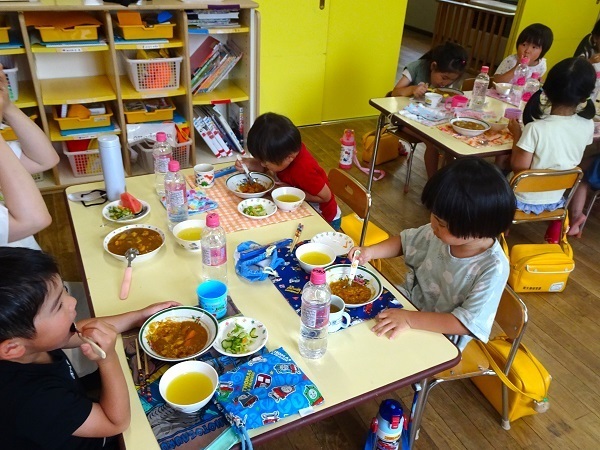 今日は、食育の日です。災害時を想定した給食が出ました。非常時用のレトルトカレー、フリーズドライスープ、塩もみ野菜、水道が使えない時のペットボトルの水、すいかなどです。自分でお湯を入れたスープを混ぜたりあたためたレトルトカレーを器に入れたり・・。子どもたちの様子をご覧ください。