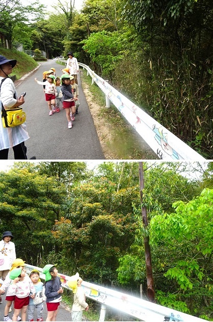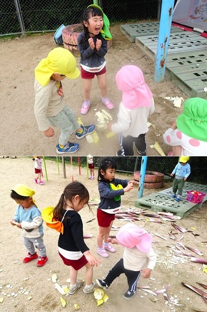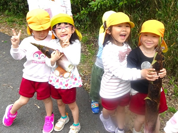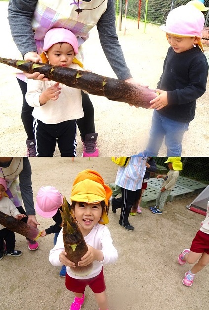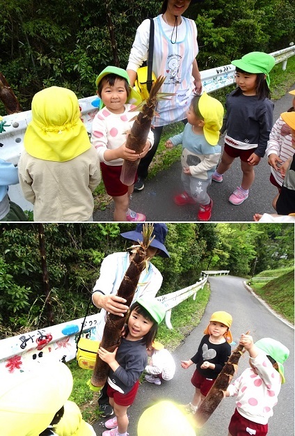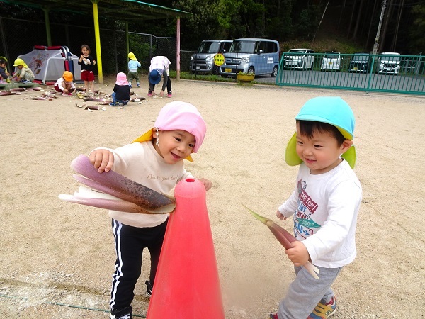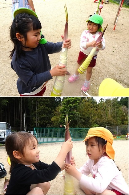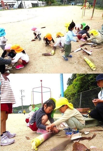 保育園の坂道わきの竹がにょきにょき伸びています。子どもたちは、竹の子?を見つけに出かけました。竹で遊ぶ子どもたちの様子をご覧ください。