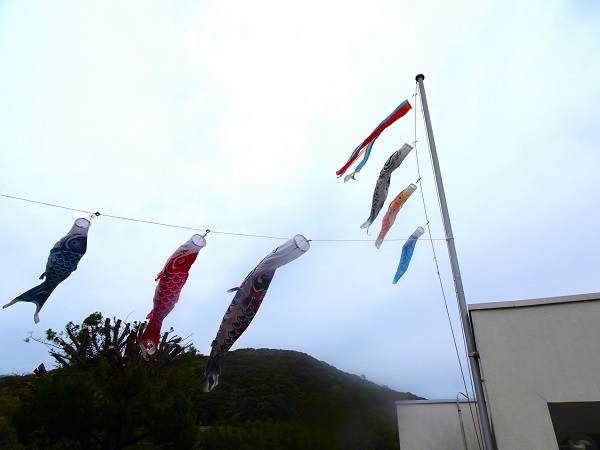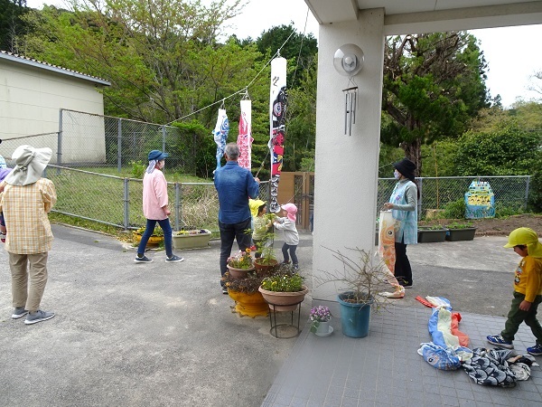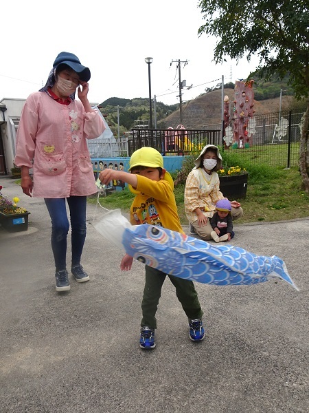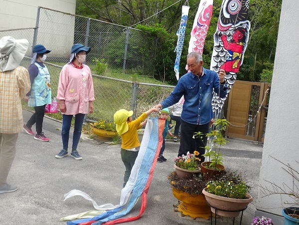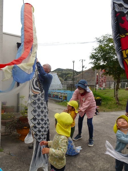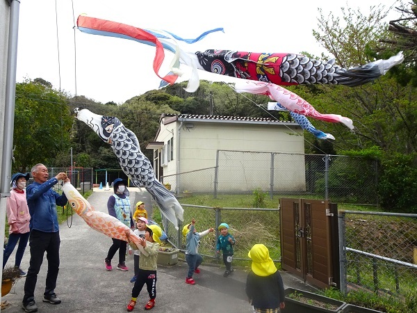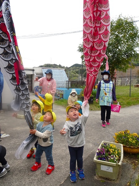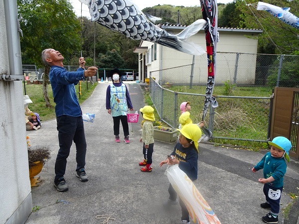 こいのぼりをあげているとき、子どもたちがやってきました。こいのぼりに触れて楽しんでいる子どもたちの様子をご覧ください。