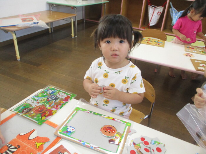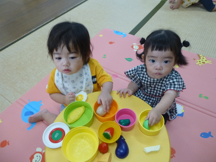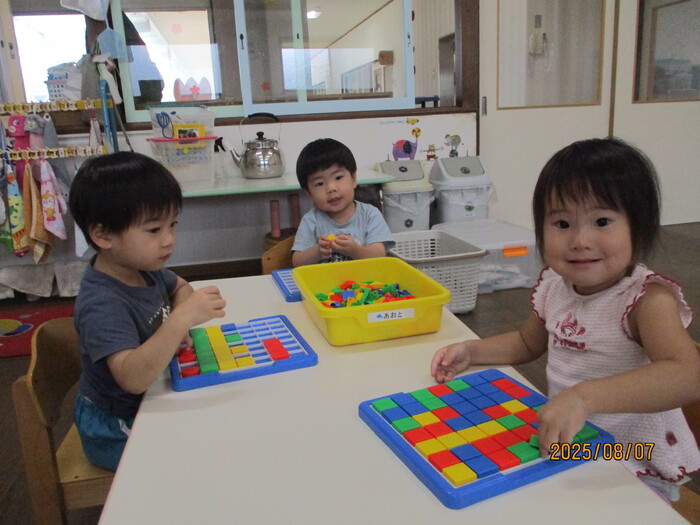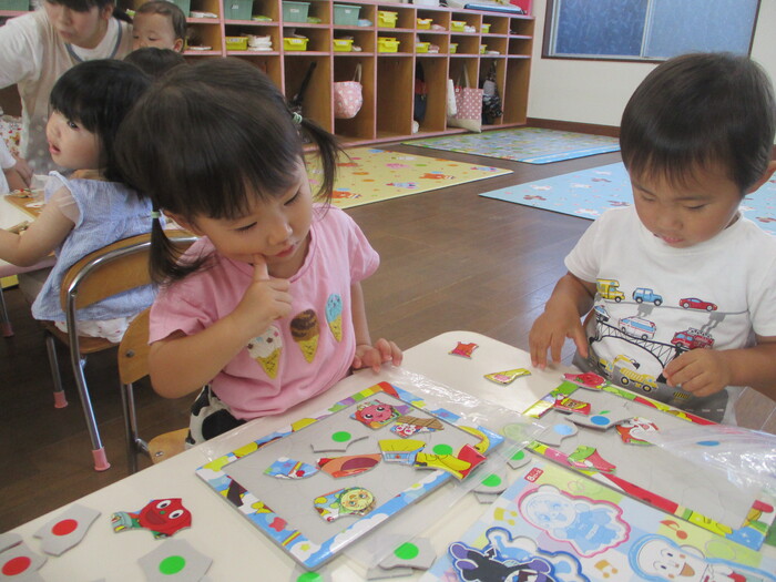 色や形、そして友だちがやっている事に興味津々✨何でも「自分でやってみたい」という気持ちがいっぱいのぱんだ組さん🥰 | ||
