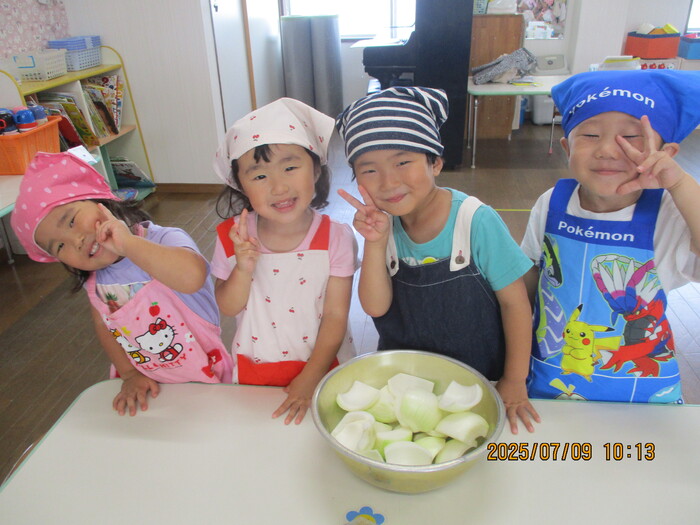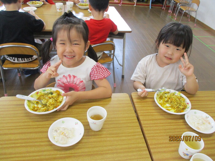 みんなでカレー作り🍛いつもは食べるだけですが、この日は生の食材に触れ、形や匂いに興味津々😲子ども達なりの発見や気づきがたくさんあったようです👍自分たちで作ったカレーは特別おいしかったようでおかわりもモリモリしていました✨ | ||