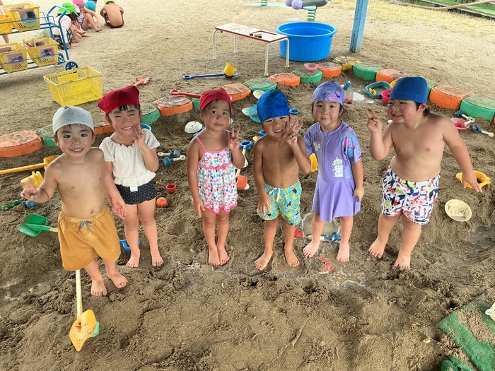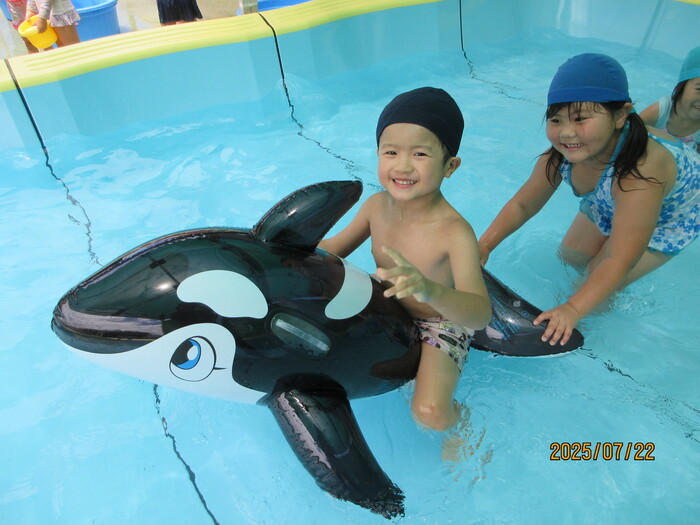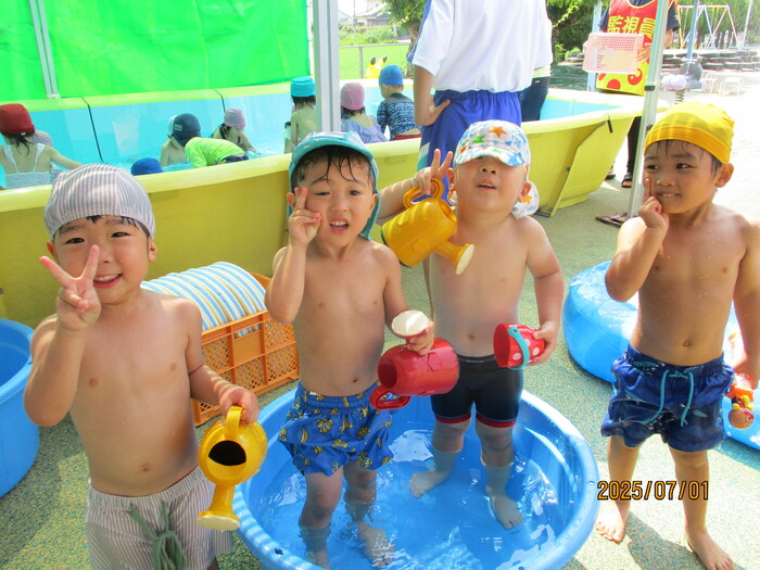保育園最後のプール遊び✨初めは水が苦手だったお友だちも、友だちと励まし合いながら少しずつ水に慣れ、最後には全員プールが大好きに💖みんなで応援しあう姿がとても印象的で、みんなの優しさがあふれるプールとなりました🥰楽しかった思い出をいつまでも忘れないでね🙂 | ||