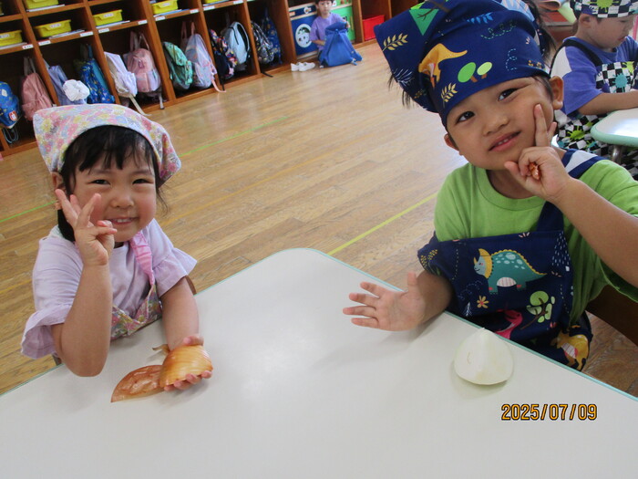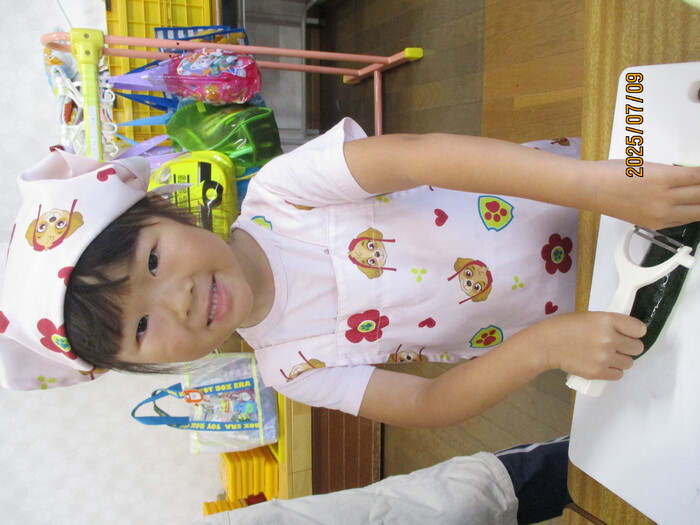 ひまわり組さんはピーラーで皮むきに挑戦🍆給食室から匂ってくる美味しそうなカレーの匂いに「はやく食べたーい」と言う子ども達がとても可愛かったです🍛🥄 | ||