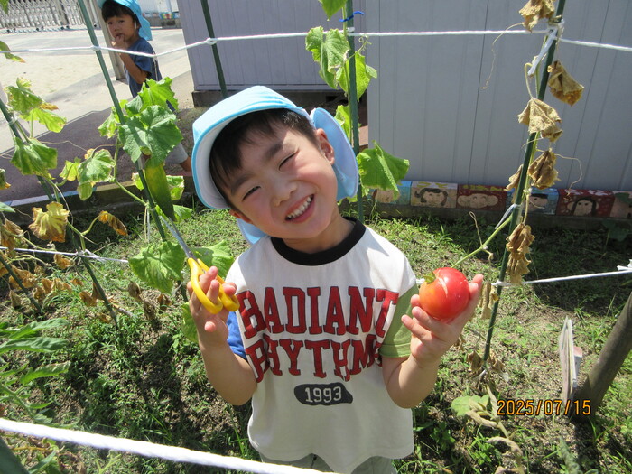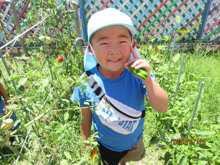 みんなが大切に育ててきた夏野菜🌞暑い中、草抜きや水やりなど頑張ってくれました✨トマトにナス、きゅうりにピーマンといろいろな野菜が収穫でき大喜び🎵給食先生に美味しく調理してもらい、お腹いっぱいになるまで食べました🥄 | ||