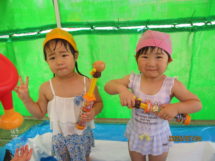 うさぎ組のみんなも水遊びが大好き✨水着に着替える時からワクワク笑顔いっぱいです🥽冷たい水の心地よさを感じながら楽しみました🎵 | ||