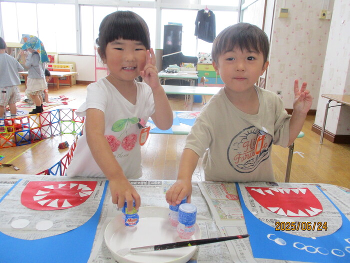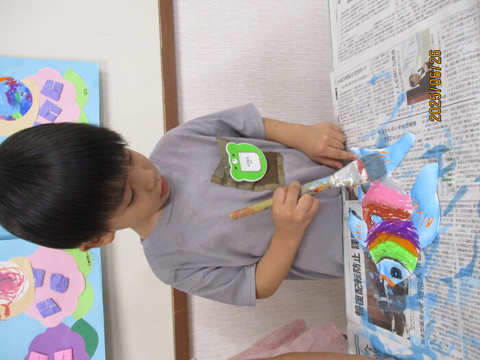 夏の制作は絵本「にじいろのさかな」をテーマに作りました🐟みんな違った素敵な作品が部屋の壁いっぱいに✨これからも「にじいろのさかな」のように優しくて思いやりいっぱいのひまわり組さんでいてね⭐ | ||