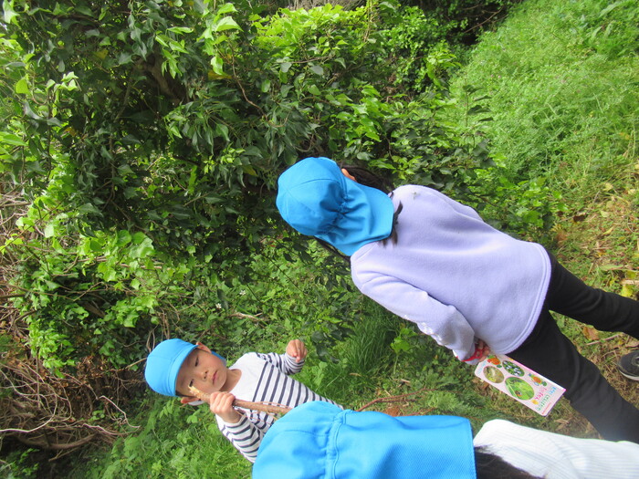 自然の中を探検すると、子どもたちの目はキラッキラッ☆ 緑の中をかけまわって、生き生きした姿がたっくさん☆ 自然の中には、おもしろいことがいっぱい! 発明家の子どもたちにとって あそびを思いつく宝の山になりました! 一年を通して何度も遊びに行ってみようと思ってま~す♡ 次はどんな発見があるかな~‼ | ||