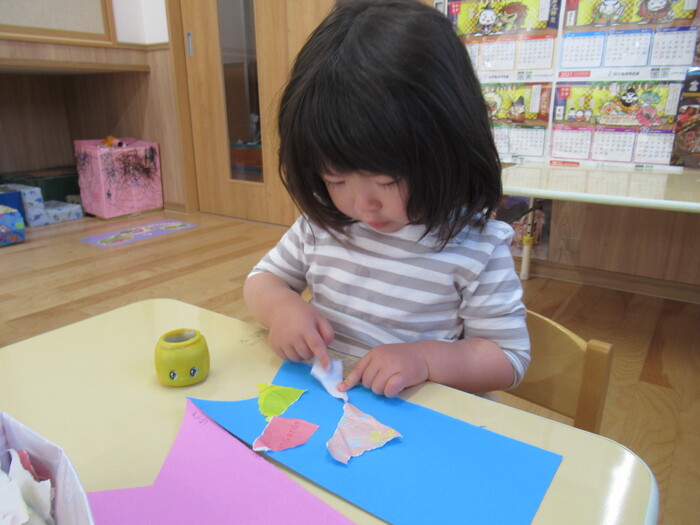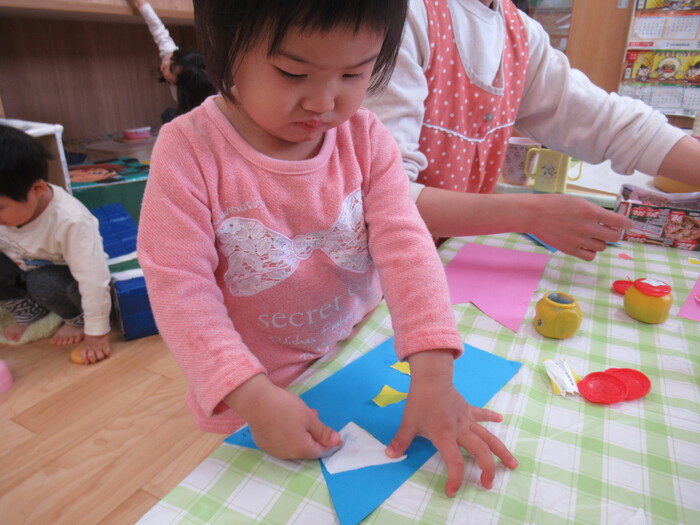 初めてのりを使いました☆ ひとさし指につけてヌリヌリ~と。手がべたべたになっても「うわ~すごい」と言って感触を楽しみながら作りましたよ(^^♪ 出来上がったこいのぼりは、廊下に飾っていますので是非ご覧ください。 | ||