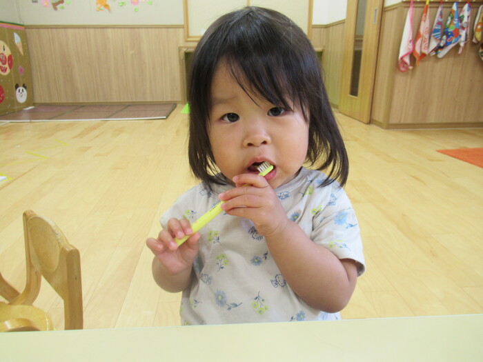 はみがきしゃかしゃか♪ 上手に歯をピカピカして バイキンさんにさようならできたかな?? | ||