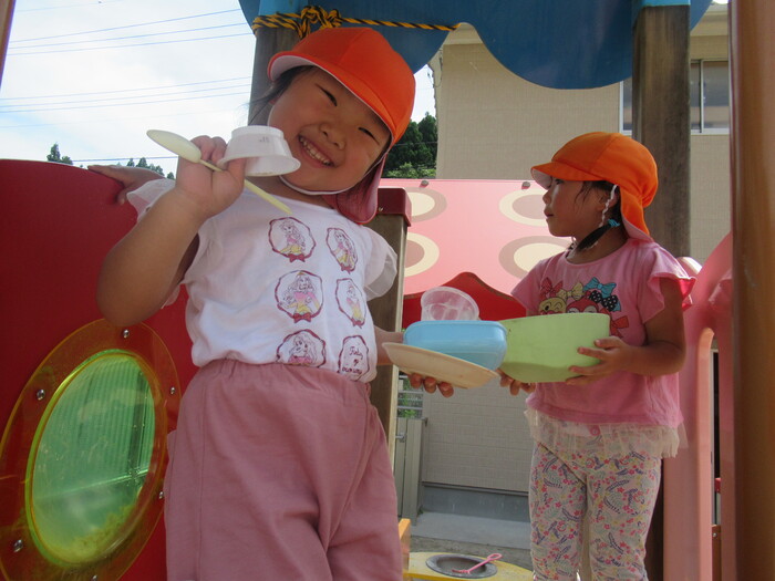 7月から色水遊びを 続けていくと、 〇色と〇色を混ぜたら〇色!! と、色の作り方に気付く お友達が 増えてきましたよ♪ | ||